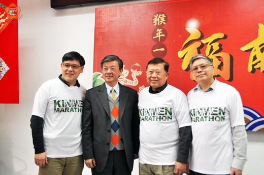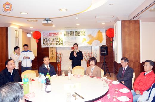 「2016金門馬拉松」活動將於今(28)日上午七時在金門大學鳴槍開跑,縣府昨晚特舉辦迎賓晚宴,縣長陳福海、議長洪麗萍到場歡迎兩岸貴賓與選手來金參與活動,並希望金門馬拉松賽在兩岸三地選手的支持與熱情參與,規模一年比一年成長,也祝福大家在比賽中都能跑出健康活力、跑出最好成績來! 金門馬拉松迎賓晚宴於昨日晚上六時三十分在葡京餐廳舉行,由縣長陳福海主持,縣議會議長洪麗萍、副縣長林德恭、副議長謝東龍、文化部次長陳永豐、省府秘書長李智雄、中華路跑協會理事長曹爾忠、台北市黨部陳永仁主委、桃園市政府秘書長游建華、廈門田徑總會主席余振杰、廈門市體育局秘書長吳明顯、三六一度(中國)有限公司總經理趙峰、陳玉珍議員、烈嶼鄉公所秘書方小萍、文化局副局長黃雅芬、維他露公司副總莊振祿、金門體育會理事長李金贊、秘書長張中法,以及來金參與體育學術研討會的二岸三地專家學者,還有來金採訪的台灣、廈門廣電、廈門衛視媒體記者……等貴賓。 本次金門馬拉松賽也特別邀請四位肯亞國際級的男、女馬拉松好手來金參加,「黑色旋風」隊伍昨日現身餐會現場,也引起大家的注目。 2016金門馬拉松賽由金門縣政府主辦,縣長陳福海致詞感謝包括金酒公司、三六一度(中國)有限公司、維他露公司、復興航空、日商優橋股份有限公司、昇恆昌免稅商店等贊助單位,以及金門體育會、金門大學、廈門廣電集團、國際馬拉松暨路跑協會(AIMS)、金門縣後備憲兵協會……等協辦單位。 因為大家的支持與參與讓金門馬拉松盛事更順暢,陳縣長說,金門在兩岸三地扮演關鍵的角色,金門馬拉松賽也是金門所有鄉親期待的大事,下午特別由中華路跑協會陳華恆秘書長與縣府教育處李文良處長實際踏勘馬拉松全程四十二公里路線,就是要讓賽事要更安全,選手們跑出健康活力,也跑出好的成績。 金門馬拉松賽今年已邁入第九屆,陳縣長感謝長期以來支持金門馬拉松的好朋友們,因為大家的支持,讓金門馬拉松賽已成為國際的賽事,本次的金門馬拉松競賽組開放網路報名後,五千個名額在十八分鐘就秒殺,顯見金門馬拉松受到歡迎的程度。明年要擴大比賽,看能不能衝上六千、七千甚至八千人,會逐步來努力,最重要是要感謝議會洪麗萍議長與謝東龍副議長以及議員同仁的支持,讓各項政策得以順利推動。 陳縣長也強調,金門扮演二岸最重要的和平關鍵角色,在這次五二○新總統上任後也有一些政策宣誓,金門、馬祖、澎湖三個離島的政策絕不會改變,二岸和平、二岸三地一家親是大家的期盼。 陳縣長感謝大家的參與,讓金門的馬拉松更多彩豐富,並祝福所有選手跑出好成績,同時能利用來金的時間來一趟愉快的金門旅遊。 議長洪麗萍也感謝主辦、承辦、協辦單位精心設計籌劃金門馬拉松比賽,尤其是今年五千個競賽組名額十八分鐘就秒殺,顯示參與者越來越多,希望藉由這個運動帶來更多的好朋友來金門觀光旅遊,也帶動全縣老幼一起來運動,大家身體越來越健康,造就金門幸福島嶼的美好未來,祝福活動圓滿成功。 福建省政府秘書長李智雄也代表省主席國發會主委林祖嘉歡迎所有來賓與選手到金門來參加比賽,他說,金門有平坦的道路與優美的環境,可說是馬拉松賽的聖地,金門鄉親熱情的呼喚與加油,會讓參賽的選手更有勁,他自己也以選手身分參加此次的比賽,在一○三年他在金門馬拉松創下個人最好的馬拉松紀錄,而選手來金門比賽,也帶動金門的觀光與經濟發展。 曹爾忠理事長指出,他曾參與第三屆金門馬拉松賽半程馬拉松的路跑,之後就接了全國路跑協會的理事長,非常高興金門馬拉松賽一年比一年好,陳縣長希望明年參與競賽組的選手能達到六千、七千人,協辦全國路跑協會必將全力以赴。而且這幾年金門馬拉松品牌非常成功,不僅帶動金門及兩岸三地的運動風氣,也創造了每年都有五千人義務幫金門推銷的宏大效果,大家一起努力提升創造二岸三地的健康幸福環境,即使再辛苦也是值得的。 2016金門馬拉松將於今(28)日上午7時從國立金門大學開跑,競賽組的五千個名額中,全馬一千八百名,半馬二千五百名,十一公里路跑七百名,除了台灣、中國的選手外,還有香港、澳門、美國、日本、馬來西亞、葡萄牙、泰國等國家或地區愛好跑步選手來金共襄盛舉。