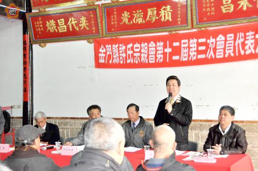 金門縣許氏宗親會昨日召開第十二屆第三次會員代表大會,縣長陳福海特別撥冗前往許氏家廟向到場許氏宗親代表致意,並回應許氏宗親建議,將原十大書坊為該宗親會資產租賃已到期收回,研擬活化興建許氏宗親會之「高陽大樓」,能從住宅區專案變更為商業區。對此,陳縣長強調,政府存在目的就是要幫助百姓解決問題,只要不違法,縣府基於公開、合法、透明,都會找法令解決問題。 陳縣長也表示,包括許氏宗親會在縣立體育館對面的土地資產,只要宗親會做成決議,都有機會來發展。並請建設處長許志忠一併「列案研究」。他本人也會一起和許氏宗親會理事長許秋霖等共同來研究。 許氏宗親會會員代表大會,昨日上午九時三十分起,在金城的許氏家廟舉行,會員代表踴躍出席參加。縣府社會處長甯國平、高雄市許姓宗親會理事長許武吉也出席與會。 大會由理事長許秋霖主持,會中,會員代表也聽取總幹事許燕輝有關會務報告。與會並就房地產權清冊、經費收支、105年工作計畫書表、土地返還、研擬活用該會資產興建許氏宗親會之「高陽大樓」(原十大書坊基地)規劃設計案、修訂會員代表推薦實施辦法等,進行討論和集思廣益。 許秋霖也在感謝宗親鼓勵與支持同時,強調重要土地一定要活化、建築利用。 縣長陳福海昨日上午十時五十分許,也在百忙行程中,由機要秘書何國楚陪同,前抵許氏家廟向許氏宗親會員代表致意,祝賀大家新的一年平安喜樂、身體健康。並強調,金城的發展和許氏宗親息息相關,許氏宗親會城區多塊土地有條件好好發展,縣府會全力來支持、幫忙。而宗親代表提出的每個個案,縣府也會一個一個認真從法令來解套。 陳縣長也感謝鄉親的牽成,讓他有機會主政當金門「管家」。他表示,這一年來一直在努力尋求突破,如斜屋頂、都市計畫、樓高解套、擴大自然村可見面積等等。儘管縣政千頭萬緒,今年春節班機因大霧讓八、九千人滯留機場及延誤行程,自己也兩天幾乎沒睡,投入協調處理班機事宜,但只要有心,問題都能解決。 他也保證,金門老人福利一塊也不會減少,反而會增加。只要縣府團隊和鄉親一起共同努力,他有信心金門一年會比一年更好。