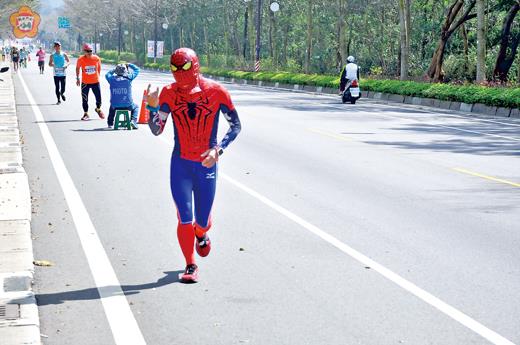 圖文/陳冠霖 第9屆金門馬拉松昨(28)日開跑,不只許多參賽者賣力向前跑,也有不少跑者更是「精心打扮」、「奇裝異服」,其中有一位男性參賽者,穿著整套「蜘蛛人」服裝參加42.195公里的馬拉松賽事,十分引人注目。雖然同樣有別的參賽者身穿蜘蛛人上衣,但這位大哥卻連頭套都準備齊全,全程戴著跑,實在「敬業」,甚至對鏡頭比了蜘蛛人噴絲的姿勢,活力充沛。 仔細看,他上半身其實是蜘蛛人短袖服裝配上雙手長袖袖套,而下半身雖然不是蜘蛛人衣服,而是藍色褲子配上紅色長襪以及紅色鞋子,不過配色與蜘蛛人服裝顏色一模一樣,相當用心。由於昨日金門天氣大好、出大太陽,賽程到了近11點時甚至感覺炎熱,也不禁讓人擔心這位「蜘蛛人」連頭套都戴著跑會不會悶熱,不過他邊跑邊回答,「OK的,就快結束了」,展現十足毅力。