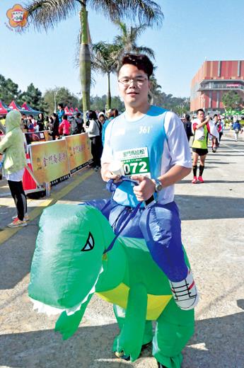 圖文/楊水詠 在昨日盛大登場的2016第九屆金門馬拉松賽中,有來自兩岸四地和各國選手參加,有路跑者穿國旗裝、有打扮成為女超人、有穿著花衣花褲,好像是馬拉松服裝一樣;其中,一位來自苗栗的謝姓路跑者穿著時下流行的恐龍裝,跑起來好像是在騎恐龍的樣子,引起加油民眾好奇!這位苗栗選手,他首次參加並挑戰完成馬拉松賽,也留下一個難忘的回憶。