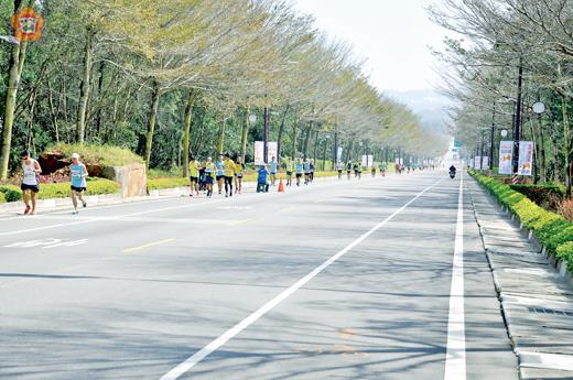 圖文/陳冠霖 第9屆金門馬拉松昨(28)日開跑,其中42.195公里的馬拉松賽事,末段賽道經由伯玉路五段、四段、三段、二段,最後回到終點金門大學。途經伯玉路三段這一大段上坡,對已經跑了35公里的參賽者而言,恐怕是最後的一大挑戰,但每位參賽者仍然堅持到底往前跑,展現運動精神,大夥看到主辦單位的攝影師照相,也都還有足夠的體力擺出姿勢拍照。眾人向前跑,配上筆直的伯玉路與兩旁行道樹,構成一幅金門一年一度才會出現的盛大景象。