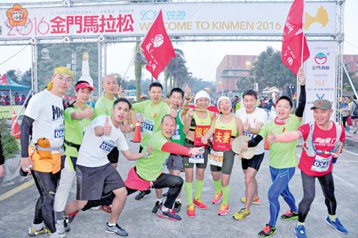 圖文/楊水詠 2016第九屆金門馬拉松賽昨日鳴槍開跑,吸引來自兩岸四地、肯亞、美國、日本、馬來西亞、葡萄牙、泰國等多國選手,有志一同齊聚在金門這塊英雄島,一起參加馬拉松和邁開步伐,奮力向前衝,挑戰自我和創造巔峰紀錄。。 今年的金門馬拉松已是國際賽會,包括泉州、重慶等長跑俱樂部多名對岸跑友也跨海參加,大陸媒體詢問金門縣長陳福海未來是否也會參加廈門馬拉松?陳縣長表示應該會參與,並說,金廈一體、兩岸一家親,金門和廈門更是親上加親,任何廈門或金門的文化體育交流未來都要更加深。 大陸跑友中,有一對重慶來的夫妻檔謝宗仿和潘泰莉(右圖),年近六十歲了,他們結婚三十六年,身上掛著「銀婚夫妻」紅布條,特別醒目。其中,謝宗仿手上還拿著古董煙菸斗,他笑說:「懷舊嘍!」。同行的男性跑友還犧牲色相,穿著肚兜跑步,十分搶眼。 另,廈門路跑者(左圖)對金門很有好感,他們說每年都有來參加賽事;今年再次組了三十幾人的路跑團參加,稱讚「金門很好、很乾淨!」他們領頭的手持旗幟,邁開腳步往前跑,充滿著歡愉的氣氛。