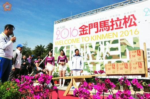 2016年金門馬拉松賽昨日清晨假金門大學盛大登場,計有一萬多名選手熱烈參與,在縣長陳福海、縣議長洪麗萍鳴槍下開跑,展開全馬、半馬及11.2公里競逐,來自肯亞好手諾理斯·比瓦特與愛蜜莉·沙墨依分別拿下全馬男女冠軍,半程馬拉松男子何盡平締造3連霸紀錄;女子游雅君參加金門馬拉松5年拿下第3次的后冠。 此外,今年有換心人張龍雄、簡鑠驊、林莉萍和楊忠魚參與,縣長陳福海說,健康是普世價值,而馬拉松是堅持到底不放棄的自我挑戰,大家把握當下,跑出健康、幸福和希望,今年馬拉松有換心人的加入,深具意義。 金門馬拉松比賽由金門縣政府主辦,金門酒廠實業股份有限公司、三六一度(中國)有限公司、維他露公司/維他露基金會、復興航空、日商優橋股份有限公司為贊助單位,協辦單位有金門縣體育會、金門大學、廈門廣電集團,國際馬拉松暨路跑協會(AIMS)、金門縣後備憲兵協會。昨天一大早雖然氣溫稍低,但並沒有澆熄金門鄉親的熱情,清晨4時左右即有人來排隊準備參加5公里休閒組,現場好不熱鬧,或走、或跑,扶老攜幼,還有推著娃娃車,全家一起來,健康休閒完賽。並由縣長陳福海與縣議長洪麗萍及立委楊鎮浯等人共同主持鳴槍起跑後,選手由金門大學起跑全力衝刺爭取佳績。 金門馬拉松活動的賽道自金門大學起程沿途經過金城的街道、慈湖路(金寧自行車道)的生態地區、古寧頭的戰區、直行瓊林吾愛吾村牌坊的文化區、環島北路、環島東路、三多路、太湖路、伯玉路等的綠色隧道區、賽道沿途風光明媚,充滿多樣的人文自然景觀是金門的特色也是吸引參賽者的條件。 為了豐富馬拉松活動,各賽道上有縣內各學校策劃的創意看板,學生們執筆畫出心中的感動為選手們加油打氣,今年更於賽道上播放馬拉松音樂及槍砲聲,讓萬名跑者感受一下昔日戰地金門槍林彈雨「跑路」的經驗,體驗戰地的風光氣息,賽道上更有近6000名的鄉親組成的啦啦隊為選手們加油,他們藉此活動展現出各有的才藝及熱情為馬拉松賽增添不一樣的人情與風味。 金門馬拉松另一個最大特色送金酒紀念酒,競賽組完賽禮│金酒特別紀念酒及金門麵線。對參加馬拉松、半程馬拉松、路跑組11.2公里選手還「獎」不完,除了有復興航空提供台灣│金門來回機票摸彩兌換券以外,還有由金酒公司提供與中獎者體重相等之金門高粱酒。