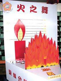 照過來,這樣的花燈你(妳)看過嗎?烈嶼消防分隊為宣導防火,巧思特別製作了「火之舞」花燈,在這次元宵節花燈展覽中亮相,想要了解燃燒的要素,知道可燃物、氧、熱能和連鎖反應,可走一趟金門縣立體育場就可得到答案。