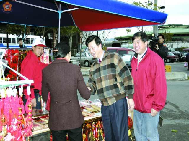 趁著春節前夕,大家忙著趕辦年貨之際,縣長李炷烽昨日清晨前往金沙、金湖菜市場巡視年貨供應情形,並向趕辦年貨的民眾及攤商們拜早年。 昨日上午七時三十分許,縣長李炷烽在建設局長李增財、金沙鎮長黃奕焮、金湖鎮長李成義等人陪同下,頂著寒風先後前往金沙鎮的沙美菜市場以及金湖鎮的新市里菜市場巡視年貨供應情形,見到絡繹不絕趕辦年貨的鄉親,李炷烽均逐一上前問候,並熱情與攤商們握手致意,詢問供貨與銷售情形,關懷之情溢於言表。在新市里菜市場還碰上一處現剖的蚵攤,李炷烽特別掏腰包買了兩斤新鮮海蚵,也希望店家們生意興隆,並祝賀鄉親新年快樂。