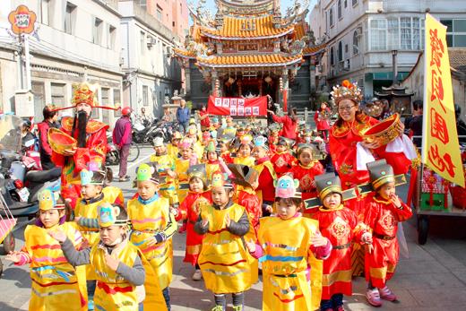 圖文/莊煥寧 昨天金城街道出現了今年第一支財神爺拜年隊伍,一早浩浩蕩蕩由財神爺及財神婆帶領著一群小小財神向大家拜年,這支特別的隊伍是由私立寶貝園地幼兒園和無敵文理補習班的一百位師生組成。 拜年的隊伍經過中興路來到城隍廟、莒光路,一路往東門市場向辦年貨的叔叔伯伯阿姨們拜年,財神爺、財神婆除了向大家拜年,還開心的發紅包給大家,祝福大家平安發財 這次的活動,是由寶貝園地幼兒園一群充滿愛心、創意的老師們,為孩子打扮成可愛的小財神,大家都萬分驚喜,並在東門代天府前為大家帶來「新年到、小蘋果」舞蹈,讓大家深深感受到了過年歡樂的氣氛,一同歡慶新年的到來,一時把整個金城街道炒熱起來。