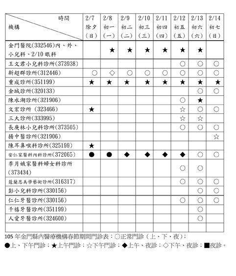 衛生局公布,2月7日至14日春節連續假日期間,提供醫療服務之醫療機構,金門醫院除2月7日及14日逢週日全日休診外,其餘時間上午皆提供內科、外科及兒科門診,下午時段休診。另,2月10日(週三)上午加開眼科門診,急診室每天24小時開設。縣內部份診所亦提供診療服務,詳細門診時間見圖,或請逕上金門縣衛生局及金門縣政府網站最新訊息查詢,或參閱2月6日金門日報第四版廣告。