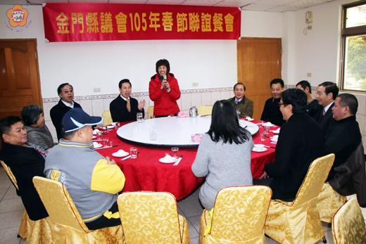 金門縣議會昨日舉辦春節聯誼餐會暨摸彩活動,議長洪麗萍、副議長謝東龍和議員等議職同仁一起圍爐,縣長陳福海也應邀回娘家一起同歡,和大家提前歡度春節,現場氣氛相當溫馨熱絡,議長洪麗萍也勉勵同仁新的一年持續堅守崗位做好各項服務工作,並祝福大家新年快樂、心想事成。 議會昨日中午在阡湖餐廳舉辦了溫馨的春節聯誼餐會,由議長洪麗萍主持,副議長謝東龍和議員石永城、許華玉、楊永立、王碧珍、唐麗輝、張雲德、陳玉珍、洪鴻斌及議會秘書長洪允典、議事主任陳勵志、總務主任楊誠國、會計主任汪秋明、人事主任呂清富、秘書朱國華及議會同仁出席參加;曾任第一屆縣議員的陳福海縣長也應邀回娘家一起同歡,而縣府秘書長黃景舜、環保局長傅豫東、金酒董事長陳永明、秘書何國楚等主管也應邀出席,和議職同仁一起提前歡慶春節。 昨日春節聯誼餐會中,議會準備了液晶電視、洗衣機、除濕機、電鍋等3C產品及高粱酒、提貨券、禮券等彩品進行摸彩,而議員與主管及貴賓也相繼加碼送現金,與員工一起進行溫馨的春節聯誼餐敘,現場洋溢著喜氣洋洋的熱絡氣氛。