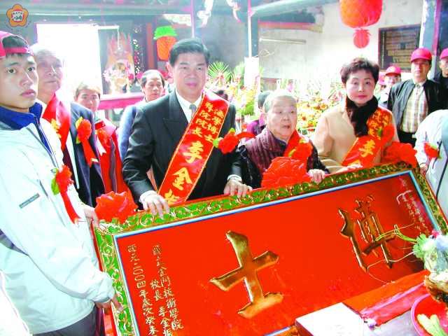 國立金門技術學院校長李金振,昨日在親友、宗親的道賀下,在古寧頭南山李氏南奇西林宗祠謁祖、晉獻博士匾,感懷祖德福蔭,由於李金振是第一位擔任大學校長的金門人,包括縣長李炷烽在內族人都感到很光彩,李氏族人分享宗親學業有成,服務社會的榮耀,整個晉匾隊伍遶行古寧頭聚落及祭祖活動,表露金門傳統古禮民風。 李氏宗親以「家有喜事」的心情組成二百多人的晉匾隊伍,並動員宗族長老,準備豬、羊,及各式祭品來祭祖,晉匾隊伍於上午九時三十分,在熱鬧的鞭炮、鑼鼓、樂隊聲中,由古寧頭林厝城門出發,在大紅布條、大鑼、托燈、中樂等前導下,李金振與妻子披掛紅布綵帶,由八十七歲高齡母親王翠女士、及兄弟姊妹一家人及宗親的陪同下,李氏宗親抬著晉獻宗祠的大紅博士匾額及李氏宗親會贈送的道賀匾額,及各式祭祖牲醴,遶行古寧頭北山、南山聚落,到達李氏南奇西林宗祠,一路上敲鑼打鼓,鞭炮聲不斷,為寧靜鄉村聚落帶來熱鬧滾滾的氣氛。隊伍在行經古寧雙鯉濕地中心時也吸引觀光客看熱鬧,感受台灣已不多見的傳統古禮的祭祖晉匾活動,觀光客也以照相機拍下難得一見的畫面。 隨後在宗祠舉行的謁祖、獻匾典禮,李金振夫婦在母親王翠女士帶領下,遵循古禮上香祭拜歷代祖先,虔誠感懷祖德福蔭子孫,並獻上博士大紅匾額,在場觀禮的縣長李炷烽、金寧鄉長李文俊、學校校長、金門技術學院師生代表、李氏族人向李金振及家人表達道賀,李金振及家人感謝宗親的熱情,歡喜之情溢於言表。 金門技術學院師生代表到場分享校長李金振謁祖、晉匾的喜悅,其中,來自美國的應用文語系教授漢貴恩博士(DR.GRANT HENNING)、漢路得(MS.RUTH HENNING)、莫莉嘉(MS.REBECCA MALLY)三人對於這項不同於外國文化的宗祠禮節最感好奇與興奮,仔細觀看謁祖、晉匾的各項莊嚴慎重的儀式,留下深刻的印象,同時也十分推許金門宗祠晉匾是尊重學者的文化儀式,鼓勵年輕人上進求知,很有意義。 十三歲即喪父的李金振,兄弟姊妹共八人,由母親王翠女士在戰火中母代父職茹苦含辛撫養長大,三兄弟分別服務金門高職、金門技術學院及成功大學,王翠女士教子有成,分享兒子學事業有成的榮耀,受到大家的道賀,內心的歡喜不可言喻。 慶典中,包括金門縣李氏宗親會、金門縣古寧頭李氏宗親會、古寧頭李氏南奇西林宗親會、增賢書室基金會、金門旅台李氏宗親會也致贈賀匾給李金振,祝賀膺任金門技術學院校長,李氏族人期望宗親不管是學業、事業有成的成就,不僅是個人的榮耀,也是宗族的光榮,也期望宗族有更多傑出優秀的子弟,來服務社會、鄉梓。 國立台灣師範大學法學博士的李金振,民國三十八年出生於金寧鄉古寧頭,八十六年擔任國立高雄應用科技大學金門分部主任,去年金門分部獨立為國立金門技術學院,由於表現傑出獲得教育部甄選為校長,他也是第一位擔任大學校長的金門人,族人與有榮焉,依據鄉俗為他舉行晉匾典禮。 中午宗祠內外並席開五十桌,現場道賀恭喜聲不絕於耳,洋溢著熱鬧的氣氛。
