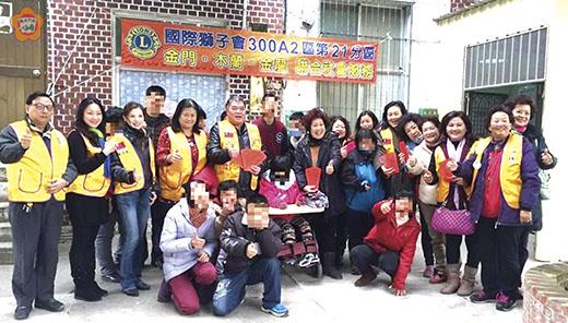 國際獅子會300A2區第11專區第21分區金門、木蘭、金龍獅子會聯合社會服務,由金門獅子會會長沈建宏、木蘭獅子會會長卯季蘭、金龍獅子會會長黃景蘭、11區專區主席陳翠羨、21分區主席翁炳信率領獅子會聯合社會服務獅友們,關心社會服務弱勢社團金門縣身心障礙者家長協會,日前前往瞭解其運作狀況及處境,並捐款以實質行動支持社團業務發展,受到社團成員及學員熱烈的歡迎。 104年起,國際獅子會300A2區第11專區第21分區金門、木蘭、金龍獅子會得知身心障礙者家長協會在金門地區致力於身心障礙者及其家庭的服務,擬將身心障礙者家長協會列為年度常態追蹤關懷支持服務的對象,適逢日前身心障礙者學員冬令營計畫中,獅友們的到訪,在這風寒地凍的天氣裡「寒冬送暖」,真正為身障家長協會挹注了強心針,促使全體成員以感恩的心回饋祈福。 身障家長協會表示,獅友們秉持獅子會最終目的及理想,提倡大同世界,發揚人類博愛的精神,遵循創立的五大項宗旨:發揚人類博愛互助的精神、增進國際友好關係、尊重自由啟發智慧、提倡社會福利、促進國家安全為依據提供服務。除了五大宗旨外,獅子會的會員尚有共同信守的八大目標,落實社會服務、關懷社會福祉既是其中目標之一;並必須遵守信條及道德的規範,關懷疾苦、扶弱濟困、人溺己溺、樂於助人既是其中規範之一。 此外,為協助寒假期間身心障礙者父母可能面臨的照顧困境,以及孩童假期間的安置問題,家長協會結合由縣府教育處主辦、社會處、金湖鎮公所、公共車船管理處、金湖國小、新市里辦公處、縣內志工隊等單位協辦,105年冬令假期營隊,期望能為特殊需求家庭分擔照顧壓力,增強學員適應多元的學習環境,以減輕身障家庭照顧壓力。在目前執行中的冬令營隊中,尚需志工朋友協助,鼓勵國中以上的學生利用放假的時間至協會做志工服務,服務日期自即日起至2月5日上班時間內(例假日除外),其服務內容除協助身心障礙學童課業及學習指導服務外,協會社工會指導志工們服務技巧,並作生命價值意義的增強,希望除了能提供學生服務人群的機會外,更能讓學生們親身體悟擁有正常身心功能的可貴與珍惜,本會志工報名聯繫電話337393、330918,歡迎家長們鼓勵孩子報名參加服務。