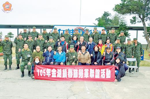 金湖鎮公所、金湖鎮代會及金湖各里長昨(2)日展開春節勞軍活動,由金湖鎮長蔡西湖和鎮代會主席呂瑞泰領軍,帶領公所各課室主管及各鎮民代表和里長,陸續前往聯勤金門地區支援指揮部、岸巡總隊、金湖分局、金湖消防分隊、海巡隊以及兩棲營,慰勞辛苦的軍警消弟兄們。金湖勞軍團為各單位送上運動飲料、禮盒、蘋果、椪柑、奇異果、蕃茄、柳丁、水梨等水果禮盒,以及高粱酒,並與各單位官兵們寒喧話家常。 金湖鎮長蔡西湖和鎮代會主席呂瑞泰表示,感謝金湖地區軍警消弟兄們平時對於鎮務的配合與協助,也肩負保衛金門的工作,勞苦功高,不在話下;農曆年將至,當鄉親們放假歡樂過節時,辛苦的軍警消弟兄仍然堅守岡位,輪班值勤,精神令人感佩,因此鎮公所與鎮代會獻上一些禮品和水果,讓軍警消弟兄們在過年期間辛苦輪值時,可以打打牙祭。各單位主官也親自出面迎接勞軍團,對於金湖鎮公所與鎮代會的一片心意,表達感謝。 巧合的是,金湖勞軍團走訪各單位時,同時也遇到金寧鄉長陳成勇帶領的金寧勞軍團,以及金沙勞軍團;年節將至,各界紛紛對軍警消弟兄致上敬意。