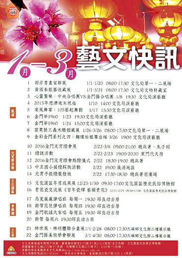 金門縣文化局一○五年春季(一至三月)藝文活動出爐,兩岸書畫家聯展、黃國泰銀器收藏展刻正展出中,另外去年演出叫好又叫座的「金門夢1960」即將於一月二十三日起一連兩天假文化局演藝廳演出。一年一度金門元宵燈會展及燈會活動亦將於二月二十二日起登場,文化局敬請民眾踴躍參與,走進藝文豐富生活。 金門縣文化局一○五年春季藝文活動於文化局、傳統音樂館、烈嶼鄉文化館、文化園區等展(演),遍及金門各處。兩岸書畫家聯展、黃國泰銀器收藏展,刻正於文化局展出。文化園區則有年度成果展青花瓷交流展《百年瓷輝‧藝韻青花》展,烈嶼鄉文化館則有林世英、林明體聯合畫展,其餘藝文展演排定如后: 文化局展演:心靈饗樂:中央合唱團VS.金門縣合唱團,一月八日晚間七時三十分,文化局演藝廳。2015年慈濟歲末祝福,一月十日下午二時起,文化局演藝廳。棠風舞宴:105藝起舞動,一月十七日下午三時三十分起,文化局演藝廳。金門夢1960,一月二十三日晚間七時三十分;一月二十四日下午五時起,文化局演藝廳。苗栗縣三義木雕館藏展,一月二十六日起至三月二十六日止,文化局第一、二展場。金彩金門系列之四:麵線姑娘要出嫁,三月二十六日晚間七時,文化局演藝廳。 元宵節系列:2016金門元宵燈會展,二月二十二日起至三月八日,總兵署、朱子祠。燈謎活動,二月二十二日、二月二十三日,晚間七時至八時三十分,東門代天府。2016金門元宵燈會點燈儀式,二月二十二日晚間六時三十分起,總兵署。中正國小提燈踩街活動,二月二十二日晚間七時起,後浦地區。元宵手提燈籠發放,二月二十二日下午五時三十分起,總兵署前廣場。 文化園區:文化園區年度成果展,一月三十日止,文化園區歷史民俗博物館。青花瓷交流展《百年瓷輝‧藝韻青花》,二月二十九日止,文化園區歷史民俗博物館。 金門傳統音樂館:每周一、四、五、六晚間七時三十分起,分別有烏克麗麗彈唱班、南管琵琶彈唱班、金門歌謠大家唱、南管,假邱良功古厝。 烈嶼鄉文化館:林世英、林明體聯合畫展,元旦起至二月二十八日止,烈嶼鄉文化館二樓展示廳。金門縣美術學會聯展,三月一日起至四月三十日止,烈嶼鄉文化館二樓展示廳。