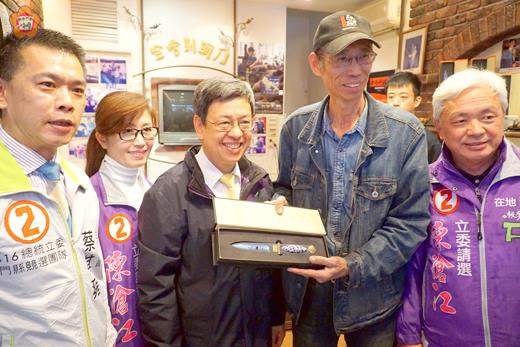 民進黨副總統候選人陳建仁昨(五)日上午飛抵金門,陪同同黨金門選區立法委員候選人陳滄江,於金城鎮、金湖鎮、金沙鎮等三個主要鄉鎮進行掃街拜票,爭取選民的支持,昨日一天行程相當緊湊,中午與陳氏宗親進行座談,下午馬不停蹄趕往衛福部金門醫院,與地區醫護、醫師座談,了解地區醫療問題,與地區醫療人士交換意見。 繼上(十二)月二日蔡英文抵金門主持「蔡英文、陳滄江聯合競選總部」成立大會,延續其高人氣,昨日有「大仁哥」之稱的副總統候選人陳建仁也來到金門,為黨籍立委候選人爭取選民的支持與認同。 昨日一早機場被濃霧所困,直至九時許才開場,陳建仁搭乘班機順利抵達金門,於十一時二十分許抵達第一站金城鎮,支持群眾見陳建仁下車後,旋即響起響亮的「凍蒜」聲。 陳建仁全程以步行的方式,一路陪著陳滄江,沿著中興路沿途掃街拜票,並進入幾家地區商家尋求支持與懇託,金門陳氏宗親熱烈歡迎陳建仁到訪,安排他到金城鎮陳氏宗祠參訪,由他贈賀匾給當選連任的金門陳氏宗親會理事長陳聰泉。沿途也有支持民眾高喊「凍蒜」,也有商家致贈禮品祝賀高票當選。 陳滄江表示,日前蔡英文主席在「蔡英文、陳滄江聯合競選總部」成立晚會作出多項維持兩岸關係與促進金門發展的承諾。 陳滄江承諾,如能順利當選後,只問是非不言藍綠、理性問政追求公平,他深知金門過去是國共戰地,未來將是兩岸和平關鍵試點。金廈因歷史與地緣難脫依存關係,他也再次強調金門民意優於黨意,並勤於基層服務,他公開支持「夏張會」與兩岸事務性首長會談於金門召開,並於金門縣議會提案兩岸通水、也主張金門自大陸接電。他的參選立委政見,更明列發揮「金門優勢」、成立「兩岸特區」、爭取「興建金廈大橋」、以及推動「小三通」升級版。 記者陳冠霖/綜合報導 大仁哥來了!民進黨副總統候選人陳建仁與立委候選人陳滄江昨(5)日下午來到金湖新市商圈與沙美老街拜票,陳建仁展現十足親民作風,許多店家鄉親紛紛要求合照,甚至有鄉親搬出家中老酒請陳建仁簽名,還有小朋友拿著筆記本給陳建仁簽名,人氣不容小覷。 民進黨副總統候選人陳建仁昨日抵金掃街拜票,並且幫同黨立委候選人陳滄江拉票,上午在金城拜票後,下午來到金湖新市商圈與沙美老街拜票。由於蔡英文、陳建仁與陳滄江的候選號次都是「2」號,因此沿途助選員不斷喊著「票投2號,支持蔡英文、支持陳建仁、支持陳滄江」,吸引商家及民眾出來圍觀。 被媒體封為「政壇暖男」的「大仁哥」陳建仁,沿途拜票露出招牌笑容,主動與鄉親熱情握手,許多婆婆媽媽看到電視上的「大仁哥」突然出現在眼前,興奮地上前要求握手和合照;也有年輕小女生拿著競選小旗子衝上前去要求和陳建仁合照,把隨扈嚇出一身冷汗;沿途許多店家更是展現熱情,紛紛拿出貢糖、燒餅等自家賣的商品送給陳建仁,甚至有鄉親捧出一甕金門高粱,請陳建仁在甕身上簽名留念;來到沙美老街拜票時,還有小朋友拿著空白筆記本希望陳建仁叔叔簽名,陳建仁當場彎著腰簽下自己的名字,鄉親們的熱情,著實看出「大仁哥」的人氣有多夯。