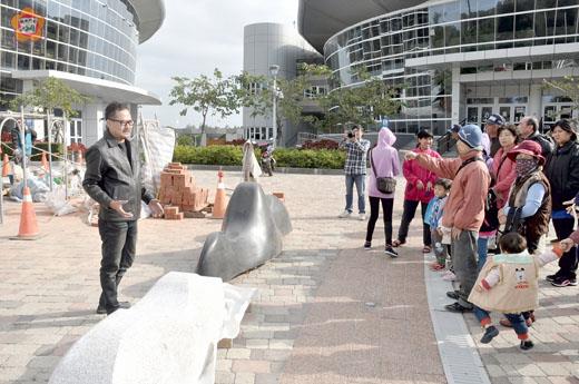 教育處日前在金湖綜合體育館室外廣場辦理公共藝術民眾參與活動,讓在地民眾與創作的藝術家面對面接觸,了解何謂公共藝術,同時也手拿石雕工具,一擊一鑿為家鄉的公共藝術盡一份心力。 1964年出生於屏東的王國益,是活動的講師暨作品創作藝術家,台北藝術大學美術系畢業的他,說明本次公共藝術的主題為「時間河流、島嶼共舞」,創作材料為石材、紅磚、不銹鋼、琉璃等材質,結合多種元素將金門的時空背景投射在藝術作品上,跳脫體育場館的概念,讓體育運動場域融入金門在地多元特色,更貼近民眾的生活,結合體育、藝術、人文,是地區具有特色的公共藝術。 活動現場吸引許多鄉親參加,大夥一同聽取王國益講解現場的公共藝術裝置以及其創作理念後,王國益現場進行石雕,在石材上以電鑽和鑿子雕刻出「I KINMEN」的字樣,同時也邀請現場民眾一起親手雕刻,許多民眾第一次嘗試石雕有點怯場,擔心傷到手或是弄壞作品,不過還是在王國益老師的指導下玩出興趣。初次體驗石雕創作的金門農工學生鄭佩璇說,覺得很新鮮、很好玩,但力道需要小心控制,否則不小心可能就會敲到手,或失誤導致作品損傷或失敗,但也從中知道雕刻師的辛苦。 教育處體健科科長王麗娟說明,創作者以金門的白海豚、海浪、太武山等意象為元素,融入公共藝術作品中,也提供機會讓民眾親身體驗公共藝術創作。而該處的公共藝術作品則從四個月前開始動工,將於近日完工,總經費為500餘萬元。 教育處長李文良表示,希望除了建置公共藝術以外,在這過程中也能讓民眾參與,希望民眾能與藝術家直接對話,除了面對面了解藝術家的理念外,也盼能激發不一樣的火花。李文良也說,該處的公共藝術作品目前還在建置過程,待建置完成後,往後也會安排學校針對美感教育等相關學科項目,帶領學生親身參與及體驗。