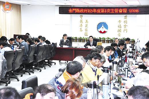 金門縣長陳福海昨(七)日主持縣政府105年第一次主管會報,陳縣長在新年伊始向縣府一、二級主官管道聲「新年快樂」,並許下新的一年有新的氣象的願望。他說,過去一年,上天給我們很多機會,也是感恩的一年;新的一年,期在過去一年既有基礎上,我們有新思維、新氣象,並站在人民的角度去思考,讓正能量能在2016展現出來。 在過一個月就是農曆春節到來,旅居在外的鄉親都會返鄉過年,陳縣長表示,去年的春運工作是有感的,今年的春運是挑戰,他下達「只許成功,不許失敗!」同時也希望讓所有鄉親看到金門經建發展的不同面貌,展望新一年的縣政新氣象。因此,陳縣長表示,不僅是自己感覺金門是一個幸福的島嶼而已,別人認同才可以;所以,他希望農林漁牧各所新春展活動要有創意外,無論在軟體、甚至在硬體上都可看到翻轉中的金門願景。 「我們準備好了!」陳縣長說,2016的縣政施政擘劃已有一定的氛圍和架構,未來的重大施政建設依序彙整和推動,並很認真的、用心的,可以做出一些有感的建設成果。雖然在2015的謀合有不同的想法,但已形塑共識,2016就走出去,並深具信心,站穩腳步往前走! 英雄淡出,團隊勝出!陳縣長指出,未來在縣務施政工作上,縣府各處局主官管將站在第一線,他運籌帷幄縣政及兩岸重大政策;尤以各處局「口袋」計畫要有外,再向中央爭取預算更積極、強度要夠和認真;而且從台灣看金門,或許更有機會爭取到預算,也要有配合計畫,陳縣長促請行政處協調和幫忙! 在縣務施政工作推動上,陳縣長說,該肯定就肯定,希望掌握住縣政議題好好去彙整,做出來的成果可以感動!他表示任何用心的,一定都可以看到成果,並可分享經驗和創意,讓團隊勝出、人民有感! 陳縣長並指出,在2016一月十六日正副總統和立法委員選舉過後,台灣的整個思維會改變,金門如何讓它不改變,而且會更好,那就是縣長的作為,「我想做,怎麼做?不是我個人怎麼做,而是整個團隊怎麼做」,希望以此一同樣的思維來看。 去年裡,兩岸交流頻繁,陳縣長說,大陸事務聯合推動平台成立一年,在定位上不清楚,他請秘書長黃景舜環控,以及兩岸如何接軌、之前所碰到環保的經驗做整合,以利兩岸事務交流推動。 陳縣長對於加速低碳島的推動政策,雖有小成果,他希望環保局在新的一年做出些低碳成效出來,也是一項挑戰,相關的議題大膽去做,並有突破性的,尤以金門島不小,與中央相對預算,應該可以做出成效。 新年新氣象!陳縣長說,2016他是行動縣長,縣府各處局也是行動處局首長、副處長和行動科長,並舉污水為例,下鄉去看一看,都會有不同的看法,下一步該形塑何種政策,並謀定而後動,讓後代有一個永續生態的生活家園。 針對為維護環境生態和與環境共生,將生物廊道、海綿城市設計概念納入考量,建設處委請執行金門縣水域環境保護研究計畫,並預定一月底前完成,相關成果報告提供相關單位作為工程設計參考。另,工務處在環北道路和湖中段拓寬新建工程,請設計單位納入海綿城市概念,後續相關案例及施工規範提供鄉鎮,讓愈來愈多的人為永續金門努力。 金門以觀光立縣,近年民宿發展相當蓬勃,縣府為促進民宿發展,希望在不牴觸中央法令原則下研擬相關管理辦法,陳縣長希望把民宿的推動當成是政策,並找出可以在地執行的法令和方法。另,觀光處提出參照交通部觀光局民宿管理辦法,在不牴觸中央法令原則且不危害公共安全原則下,彈性協助民眾申請民宿營業需求,並定期辦理經營管理研習課程,輔導民宿提升效能及旅客住宿品質。 針對金酒公司儘速成立水獺保育基金會,以建立企業良好品牌形象,陳縣長促請金酒儘快來做;至於其執行情形,金酒已經草擬完成財團法人金門酒廠水獺生態保育教育基金會捐助章程和完成修改;目前,縣府建設處正在協助確認主管單位,待確定後,即可開始基金會的設立申請事宜。 另,為維護地方特色或傳統建築而限制人民申請建案,陳縣長指出,相對的要有相對的誘因,如土地交換或容積轉移的誘因;同時,他促請文化局和建設處彙整和做相關的了解,該怎麼做的再一起討論。 此外,有關他縣市開辦月子餐到府服務之施政作為,衛生局和社會處分別說明研究評估可行性,陳縣長請社會處和衛生局參考他縣市經驗擬訂出方向,提交政策小組做定調,並強調任何一個社會福利應更嚴謹和完整的作法。 陳縣長強調指出,重大政策是由下而上,政府施政以民意為依歸;一些施政透明化讓各界支持。至於金門大橋興建工程處於落後工進狀況,陳縣長也請工務處與國工局討論如何因應和面對,交通部長陳建宇也下了「軍令狀」,希望大橋工進趕上,如期如質完成,以符鄉親的期待和希望。 此外,縣府政風處長柯偉宏也以公務員廉政倫理規範為例,作政風處SOP簡報;去年,縣府政風處業務總績效獲法務部廉政署評定為第一名;廉政志工隊獲評為績優志願服務團隊優勝獎;志願服務績效評鑑目的事業主管機關獲為進步獎。 最後,陳縣長表示「只要對金門有幫助的,我都很樂意來面對它;而且,不管用什麼方式,我都要去努力」;同時,陳縣長預判未來兩岸有多發展,金門不得不準備好,縣府團隊主官管一定要承擔,尤以一些外在因素會被困擾著,所以一定要每一環節要環環相扣,謀定而後動,展現新年新縣政新氣象。
