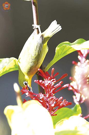 圖文/董森堡 綠繡眼是金門地區常見的留鳥,常出現在植物花叢中啄食花蜜以及果實。一隻綠繡眼就在植物園裡的紅樓花上展現精彩的身手,倒掛著身體吸取花蜜,模樣甚為可愛逗趣。 一身橄欖綠的羽色的綠繡眼,鳴聲清脆悅耳,自古以來即是詩人及畫家最喜描述的鳥類之一,地區林園、野塘畔不時可見這可愛的鳥類,根據台灣野鳥圖鑑的記載,綠繡眼體長約11公分;背部羽毛為綠色,胸和腰部為灰色,腹部白色;翅膀和尾部羽毛泛綠光;明顯的特徵就是眼的周圍環繞著白色絨狀短羽,形成鮮明的白眼圈,故名繡眼。繡眼閩南語稱Q軟仔、青笛仔、青啼仔。是中國著名的觀賞鳥。
