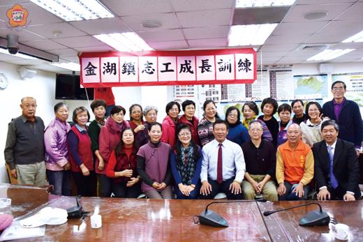 金湖鎮公所於20日舉辦「綜合福利服務隊志工成長訓練研習」,該隊志工共31名,平時每週定期訪視關懷轄內獨居長者,為提昇其志工專業能力,故辦理由陳水湖醫師主講的「長者常見疾病與預防」以及楊婉珍護理長介紹「衛生保健與健康操」課程,讓志工們能有自我充實並儲備照顧獨居長者的能量與知識。 金湖鎮長蔡西湖表示,感謝主講者撥冗分享專業知識,亦提醒志工們關心他人之餘也要照顧自己,志工服務是無私奉獻的工作,感謝志工對金湖鎮獨居長者的關懷。蔡西湖說,近來由於居民生活型態改變,因此家庭核心成員遠在外謀生者增多,衍生獨居長者、獨居身心障礙者之獨居與照顧等問題,希望透過研習訓練活動培養志工專業精神與能力、落實志工服務知識與技巧,期待志工能提升服務專業,未來服務期間皆能著本所制服,以強化志工隊之識別與整體性。金寧鄉長陳成勇也到場分享其帶領志工隊的寶貴經驗,期盼未來兩鄉鎮的志工能增加交流機會。 針對「長者常見疾病與預防」課程,陳水湖醫師特別分享平時醫療巡迴的行醫實務經驗以及對於「在地老化」、「社區照顧」的概念,並與志工們討論長者常見的高血壓、糖血病等生心理疾病如何預防與重要的衛教,志工們與醫師討論相當熱烈,志工的提問皆是獨居長者常見的用藥、就醫等狀況,互動相當熱烈。在「衛生保健與健康操」課程,楊護理長亦將其平時如何與患者進行衛教的內容和技巧,全數傳授給志工們,並帶領志工活絡筋骨,動一動做保健操,讓志工有更多與長者互動的「撇步」。在參與全日的課程後,志工們皆覺得受益良多,並表示,老化是每個人未來要面臨的課題,希望能帶著今天學到的功夫,照顧自己也造福社區長者。 金湖鎮綜合福利服務隊成立約15年,平時服務該鎮轄內弱勢民眾,特別是獨居長者,為有效建立健全之專業人員培訓制度,增進參與學員社會服務專業知能,扮演志工之積極角色,以增強服務功能,藉由訓練課程,充實長者健康之相關知識,不僅能照顧自我健康,亦能於訪視時,提供獨居長者健康照顧之資訊,使長者能有效預防疾病。此外,除透過訓練提昇志工專業服務知能外,另提供志工服裝,以強化志工隊之識別與團隊整體性。