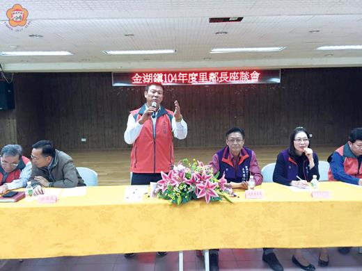 圖文/陳冠霖 金湖鎮於21日下午在鎮公所三樓會議室召開一年一度的里鄰長座談會,由金湖鎮長蔡西湖及鎮代會主席呂瑞泰共同主持,公所各課室主管及鎮代表也一同列席,傾聽基層聲音。大約有近50位里鄰長到場參加,反映各鄰里鄉親所遇到的問題給鎮公所。蔡西湖表示,為民眾謀福祉,是自己和鎮公所團隊一直以來努力的目標,也為了讓民眾能有更美好的家園。