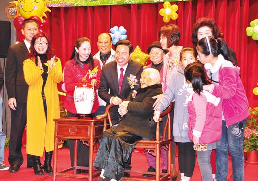 縣府昨(20)日於昇恆昌金湖大飯店舉辦「縣長就職週年感恩惜福活動」,適逢金門建縣100年,縣府邀請縣內46位百歲人瑞共襄盛舉,縣長陳福海和議長洪麗萍一一和百歲人瑞們合影,並致贈壽酒,有些老人家行動不便,陳縣長和議長洪麗萍也幫忙攙扶他們上下舞台;有些老人家看到縣長很高興,與縣長互動熱絡,甚至有一位百歲阿嬤還主動親了縣長一下。 金門縣這46位百歲人瑞當中,當屬金寧鄉的蔡李明羨和金沙鎮的黃網治最為高齡,都是109歲,相當長壽。其餘各鄉鎮百歲人瑞包括: 金城鎮共16位:陳楊水蓮(108歲)、董玉意(105歲)、李羨音(103歲)、蔡春生(103歲)、方能巧(103歲)、呂夜合(103歲)、許丕謀(103歲)、林冬(102歲)、洪印(102歲)、葉寬治(102歲)、黃杰(101歲)、黃寶貝(101歲)、顏金萬(100歲)、李黃錦(100歲)、洪歉(100歲)、董天補(100歲)。 金寧鄉共8位:蔡李明羨(109歲)、余叻(108歲)、蔡廷樹(103歲)、李王寶珠(103歲)、李張妹(102歲)、陳李苞(101歲)、陳水閣(100歲)、陳薛能鶴(100歲)。 金湖鎮共8位:陳水治(108歲)、呂陳羨(105歲)、郭關攀(103歲)、呂陳甜(103歲)、呂吳緞(103歲)、陳勤(102歲)、呂黃昭(100歲)、李陳名(100歲)。 金沙鎮共8位:黃網治(109歲)、翁英(106歲)、梁勤治(103歲)、何玉霜(103歲)、陳文宰(103歲)、蔡淑靜(103歲)、楊伴治(102歲)、陳淮欉(100歲)。 烈嶼鄉共4位:方堃(102歲)、蔡洪頁(102歲)、洪源財(100歲)、呂洪粉(100歲)。 陳縣長表示,過去一年共同見證金門的成長與蛻變,因此活動主題訂為「從感恩出發、從惜福開始」,過去100年來,金門改變許多,從遍地黃沙變成綠意盎然,從戰地前線變成兩岸樞紐,從滿目瘡痍變成美麗家園,從殺戮戰場變成觀光聖地,從貧困僑鄉變成美好金門,而這些百歲人瑞尊長都是最佳的歷史見證。陳縣長認為天下的父母都是最偉大的,他勉勵在場所有人要以「感恩惜福」的心,感謝每一位阿公阿嬤、父母親和家人對我們的付出。