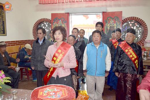 圖文/陳冠霖 議長洪麗萍昨(20)日10:30在議員張雲德、蔡春生、議事主任陳勵志、總務主任楊誠國、會計主任汪秋明等議會同仁陪同下,一同前往位於金湖鎮下新厝的鷹龍廟參加奠安慶典。議長洪麗萍等人依照古禮向廟中朱府王爺等眾神上香、獻匾、獻花、獻果並敬獻爐敬金,祈求地方鄉親安居樂業,平安喜樂。 廟方表示,下新厝鷹龍廟原先暫奉民宅,敬拜不便,於民國61年發動鄉民與旅星華僑捐款興建。昔日興建以傳統簡易方式,歷經40多年裂痕腐蝕、坍塌堪慮;而在村民同心協力與熱心人士捐獻資助下,於民國100年動工重建;在慶典活動中,廟方也請來繡花園戲劇團共襄盛舉,使得氣氛更加熱絡。