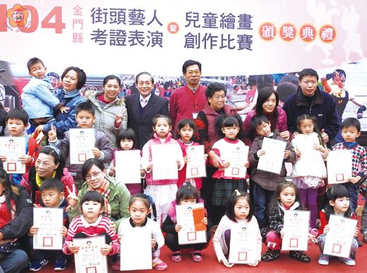 金門縣文化局兒童繪畫創作比賽,十二月十二日假城中體育館舉辦,分四組吸引三百九十七位學子參與,經過專業評審揭曉各組績優作品及得主,並於昨日上午九時假浯江書院公開頒獎表揚。秘書長黃景舜表示,希望透過活動培養未來的藝術人才,發掘小小畫家,也鼓勵喜歡塗鴉、繪畫小朋友多接觸,培養藝術細胞,將對未來助益無窮。 文化局首次以現場公告題目、限時創作方式舉辦一年一度兒童繪畫創作比賽,共分四個組別,於十二月十二日比賽,結束後文化局聘請專家進行評選揭曉各組特優、優選、佳作及入選得主,成績已公告於文化局網頁,昨日假浯江書院結合今年度街頭藝人考證活動頒獎,吸引許多家長一同見證孩子的優異表現。 縣府秘書長黃景舜表示,文化局舉辦繪畫創作比賽用意在提昇兒童藝術創作、鑑賞能力,培養未來藝術人才。有藝術天份要從小培養,鼓勵有天份或喜歡繪畫的學子們不要埋沒才華,要多接觸、培養藝術細胞,在繪畫中走出屬於自己的一片天地。 文化局局長呂坤和也分享,他自幼喜歡塗鴉,第一次參加寫生比賽的情景他至今仍記憶猶新,獎狀也一直保留到現在。呂局長也引述電影《魯冰花》中一段出身貧困家庭的學生,遇到一位美術老師後一連串的感人故事,藉由繪畫創作比賽讓喜歡畫圖的學子有自由的創作,盡情揮灑,發掘自己的才華,更期望有天份的小朋友不要被埋沒。 昨日頒獎典禮於上午九時起登場,吸引許多家長到場見證孩子的優異表現,而文化局配合活動也自九時三十分起推出臉書「藝起金門」打卡抽獎,世遺推廣,圖書資源、成語等關卡,宣導重要的藝文資訊,圖書館館藏及借閱訊息以金門申登世遺的推展,並大方致贈文宣品,廣受大人小孩歡迎爭相排隊參與,滿載而歸。