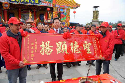 金湖鎮下新厝鷹龍廟舉行奠安慶典,金門縣政府昨在縣長陳福海的率領下,前往鷹龍廟上香獻匾、獻爐敬金,並祈求風調雨順、國泰民安。 慶祝鷹龍廟舉行奠安慶典暨啟扉活動,縣長陳福海在昨天早上十時,率領縣府一級主管前往鷹龍廟參拜,眾人依循古樂禮俗向廟中供奉的朱府、金府等王爺上香敬禱、獻爐敬金致意,並獻上威靈顯赫牌匾表達敬意,並與下新厝民眾閒話家常。 據鷹龍廟管理委員會表示,位於金門縣金湖鎮溪湖里下新厝十三號的鷹龍廟因面向鷹岩山而命名之,廟中主祀金王爺、朱王爺,每年的八月初十、十一為朱府王爺聖誕,該廟於民國六十二年興建,並於民國一百年重建,增設息仔寺等建築,鷹龍廟內的眾家王爺神威顯赫、法力無邊,是當地居民的信仰中心之一。 除了舉行奠安活動外,昨日下午鷹龍廟也舉行繞境巡安活動,廟中的輦駕與神尊們會合後,組成盛大的繞境隊伍展開巡安的儀式,在繞境巡安過程中,來自金城鎮、金湖鎮以及金沙鎮的公揹婆、鑼鼓陣、十二婆姐陣、電音三太子等陣頭等也應邀參加遊行,現場氣氛可說是熱鬧滾滾,充滿一片人神同歡的慶典氣氛中。