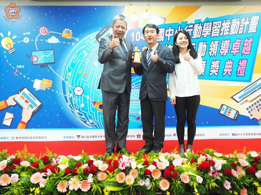 教育部辦理104年國中小行動學習優良學校頒獎典禮上月底於資訊月教育部數位教育博覽會中舉行,本縣大放異彩,計有中正國小、西口國小、開瑄國小三間學校獲得行動學習優良學校獎,校長張栢樾、楊肅健、孫麗琪也赴台接受教育部政務次長陳德華頒獎表揚。 教育部為鼓勵學校發展數位科技在教學應用之特色,培養學生善用數位科技溝通表達、合作學習、問題解決、創意思考及批判思考的能力(5C),已經連續四年辦理國中小行動學習推動計畫,今年全國共有36間國中、124間國小參加,為評鑑實施成效,於本年度11月5日至6日假高雄國際會議中心辦理期末成果發表會,經由分組十分鐘之期末成果報告,八分鐘之評審教授提問詢答,在台省大校競爭激烈下,本縣有中正國小、西口國小、開瑄國小三間學校獲得行動學習優良學校獎,同時三間學校校長張栢樾、楊肅健、孫麗琪亦獲得行動領導卓越獎,成果豐碩,獲得獎項在各縣市評比,僅次於南投縣(四座),與台北市、高雄市、台南市和宜蘭縣一樣,同為獲獎三座,若以得獎率來說,高達六成(本縣參加校數5間),是全國實施成效評比最好的成績,而中正國小和西口國小也是本縣第二次獲獎的學校。 中正國小今年設計了DI-ASSURE教學模式,運用資訊科技結合英語教學,透過協同學習,提升學生的學習興趣和自信,也關注學生的個別差異,他們發展了教師專業學習社群,透過金門四季的節慶活動英語導覽和skype遠距英師和學生會話,希望能讓學生自主學習,落實多元智慧之發展。 西口國小以行動學習「STEP UP」教學方案獲獎,透過S(Situation)、T(Task)、E(Explore)、P(Partake)教學策略實施,鼓勵老師運用到現行的核心課程,例如國語科閱讀理解教學、數學科TBL團隊合作學習、心智圖應用於腦力激盪、組織規劃課程、Raz-Kids英語電子書教學等,同時強化課中學生之即時反饋、師生互動雙向溝通,課後學生之學習診斷評量與補救教學;另一方面也展開行動學習的創意課程,如英語單字闖關遊戲、自然科的微觀與巨觀、自然科鄉土踏查活動、Google Art Project藝術賞析與創作課程。 開瑄國小則以【玩美瑄言】課程方案將行動學習運用於專題探索和特色課程上,透過科技載具的輔助,讓孩子們以文字記錄感動的片刻,用鏡頭捕捉生活的瞬間,藉影像留住時間的永恆,讓心中的悸動牽起世代間的情感。在學科上,也讓老師嘗試運用科技成為學生學習的利器,在教室直接架設平板並連結老師google帳號,讓孩子們利用下課時間將習作或試卷錯的題目拍照,在後端,老師則可蒐集孩子易犯的錯誤類型,進行補救教學。