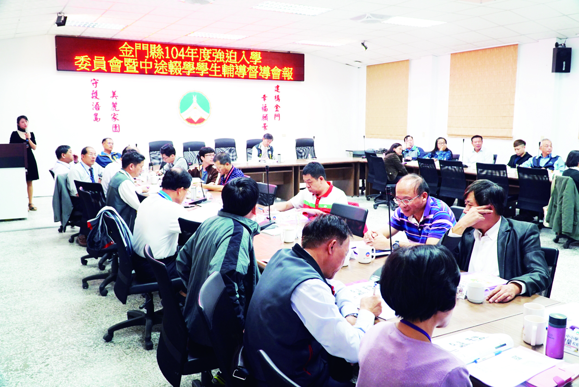 金門縣政府昨(二)日召開「金門縣一○四年度強迫入學委員會暨中途輟學學生輔導」第二次督導會報,邀請各校人員、相關單位針對中輟學生案件進行商討,集思廣益。 「強迫入學委員會暨中途輟學學生輔導」第二次督導會報,會議由副縣長林德恭主持,縣府社會處長甯國平、衛生局局長陳天順、教育處處長李文良、家庭教育中心主任王任益、家扶中心主任李桂平、金湖鎮長蔡西湖、校外會教官楊國良、各校校長、各鄉鎮業務承辦人員、縣警局人員等單位派員參加。 林德恭表示,學生的受教權是不容許被剝奪的,而縣長在上任以來對各級學校的教育也很重視,對於地區中輟學生案件,應僅剩一件尚未解決,召開這項督導會報,就是希望邀請各界專業人士,端賴大家的集思廣益,共商解決之道。 承辦的中心學校金沙國中表示,這項會議目的在落實國中小中輟生通報辦法,以有效協助中輟生順利返校,並落實跨局處的溝通協調,以加強追蹤輔導中輟生復學,維護中厝生就學的權利。而目前地區截至十一月三十日止,金門縣線上通報中輟人數僅有國小一人,並非當年度通報,中輟通報學校也相當努力,每兩周、每月都會前往家庭訪視,了解,並與父母溝通。