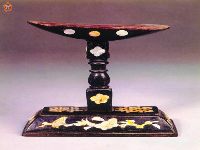 前文所述中國在宋、元、明、清四朝的木雕技藝,已達「爐火純青」的境界,由於當時經濟尚稱發達,不少治生致富的商家也躋身風雅之列,又由於文人雅士的喜好與支持,木雕藝師運用其巧心妙手,把木雕藝品加鑲螺鈿,使工藝品益趨精細雅緻,其成品也行銷全國各地。 圖示此枕似是仿燭台形制做成,枕座上鑲有螺鈿雙喜兩字,是慶賀新婚之禮時特製之物,白色囍及花鳥紋襯著黑檀木,效果甚佳。