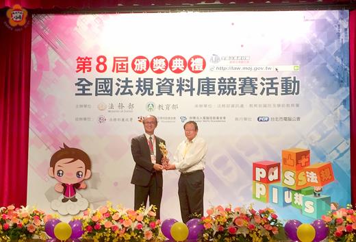 「第八屆全國法規資料庫競賽活動」成績揭曉,在二賽項中,本縣榮獲「縣市推動獎第二組第一名」殊榮,縣府教育處副處長陳金文本月21日特別代表縣府赴台北集思交通部國際會議中心5樓受獎,由教育部林騰蛟常務次長及法務部羅瑩雪部長共同頒獎。 教育處指出,為持續落實各校深耕法治教育,並提升國中學生參與競賽意願,這項競賽活動設立為「學校推動成效獎」及「縣市推動成效獎」二獎項,其中縣市推動成效獎以縣市為單位分為兩組,每組各11縣市分別以參加「法規知識王網路闖關競賽」校數最多及參賽人數比例最高的縣市進行頒獎。本縣所轄國中參賽校數100%,參賽學生比率高達41.6%,獲得「縣市推動獎第二組第一名」殊榮,參賽人數比例則由本縣金寧中小學奪得最高,參賽學生人數高達99%;另金沙國中參賽人數也高達84%,名列第二,表現優異。