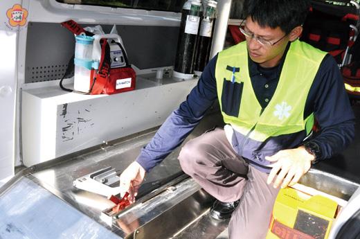 繼研發專利水帶攜行帶後,「點子王」之稱的李錫安又研發出「擔架確保器」,並已獲得中央標準局審查通過專利申請,昨日在金門縣消防局舉辦「金頭腦記者發佈會」,介紹他的專利新品。局長楊肅凱特別嘉勉他,允諾儘速在全縣救護車上安裝。消防同仁也與有榮焉,稱這套設備為「凱安一號」。 金門縣消防局於昨(25)日上午九時召開「金頭腦記者發佈會」,由局長楊肅凱主持,「點子王」金寧分隊李錫安介紹最新研發消防利器-「擔架確保器」,並已獲得中央標準局審查通過專利申請,本縣消防局將為該專利第一個獲得授權使用單位,未來能廣泛使用於救護車上,造福民眾以提升救護品質。 局長楊肅凱指出,縣消防局金寧分隊隊員李錫安為同事口中的「點子王」,常於工作中加上自己的巧思,讓亮點豐富了工作的內容,遊走校園防火宣導更受小朋友愛戴,前日(11/15)於金寧中小學設攤宣導,利用「棉花糖機」成為活動中焦點,小朋友爭先恐後地搶答防災知識,寓教於樂,讓防災宣導內容多元豐富。 鑑於現行救護車因無防止擔架摔落設備,導致傷病患二度受傷事件偶有所聞;李錫安因而設計研發出「擔架確保器」,並獲得專利申請;這也是李錫安繼研發專利水帶攜行帶後,再一次的發明。 在同事口中有「點子王」之稱的李錫安,昨天在消防局「金頭腦」記者會上介紹了他的專利新品。李錫安說,一般救護過程中,由於救護車後車廂的內部僅為表面平滑的平台,沒有任何卡制擔架的結構;當救護車行駛速度較快或彎度較大時,可能導致擔架位移,甚至翻覆。此外,救護車到達醫療院所時,可能因救護人員精神或體力不濟等人為疏忽,造成擔架床在下車過程中翻覆,或者擔架床的腳架尚未升起前就放手,而發生擔架床直接由救護車上跌落的意外。 他舉例說,台灣某消防分隊在載送發燒病患就醫時,到院操作擔架下車過程中,病患摔落地面造成頸椎骨折,引發下肢癱瘓;有鑑於此,李錫安發想出由滑軌和安全扣環卡榫組成的「擔架確保器」。他實際操作說,藉由擔架前導輪的橫桿將扣環卡榫往內帶進,翻轉定位後,擔架得以固定;移出擔架時,也是藉由前導輪的橫桿將扣環往外帶;雖然擔架腳完全展開,但不會離開救護車,藉由副手把擔架放到地面,避免摔車意外。 李錫安表示,因為怕擔架離開救護車時腳架發生軟腳,擔架重摔到地上,救護摔擔架造成的意外,除了造成民眾生理身體上實際的損傷外,更加深了民眾與消防救護間的不信任感,尤其摔傷理賠動輒新台幣上百萬元,確保器成本才不到1萬元。所以混亂的救護現場,親人的受傷,本來就會使人的緊張倍感增加,而此時發生摔擔架的意外,將很有可能造成救護同仁與民眾的衝突。李錫安研發出裝設於救護車輛的「擔架確保器」,除了確保傷病患於擔架搬運過程的穩定性外,更讓同仁執勤過程中避免造成職業傷害。 楊肅凱表示,擔架確保器除了確保傷病患在擔架搬運過程中的穩定,更讓消防人員執勤過程中避免職業傷害。全金門消防隊共有10輛救護車,楊肅凱允諾儘快在每輛車上安裝;他並透露,已有台灣消防單位向金門縣消防局接洽引進這套設備。 楊肅凱呼籲同仁保護人民生命財產是消防工作的本質,而利用創意讓工作更臻完善實屬難能可貴鼓勵同仁對於工作應保持熱忱,並多方思考,讓好還要再更好。