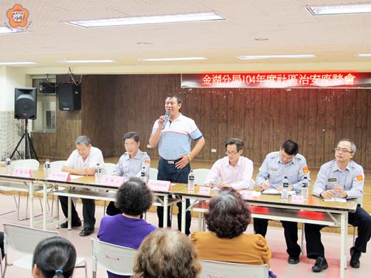 金湖分局於18日晚間於金湖鎮公所三樓會議室召開分局自辦治安會議。會議由分局長鄭鴻文主持,金湖鎮鎮長蔡西湖、金沙鎮秘書陳淮任列席,金湖鎮及金沙鎮多名里長出席,消防局、警察局防治科、刑事警察大隊等單位皆派員與會,與居民共同討論有關治安、交通、消防等生活相關議題,社區民眾80餘人參加會議,場面熱絡。 會議前先由金湖消防分隊隊員林蔚尚講授消防逃生常識。金湖分局偵查隊隊長林練雄講授當前金門地區常發生刑事案類,及竊盜、酒後駕車及毒品日漸氾濫等議題。金湖分局第一組組長廖建棠講授當前金門地區交通事故狀況,告知民眾地區易肇事路段、時段,並提醒民眾務必遵守道路交通安全規則及路權規定。 此外,金湖分局特別邀請福建金門地方法院檢察署檢察官葉惠燕及書記官長董秀珍向在場民眾進行反賄選宣導,本年度適逢第九屆立法委員暨第十四任正副總統選舉,如有知悉賄選相關情事者,可撥打反賄選專線0800-024-099,當個啄木鳥,揪出社會的害蟲。 會議中,新頭社區守望相助隊隊員王阿庚、瓊林里里長蔡顯明及新湖里里長陳文顧等,均提出社區內需改善的道路路段及建議增設相關設施,以能減少交通事故的發生。 金湖分局分局長鄭鴻文表示,近期發生數件因機車鑰匙未拔而遭竊及汽車車窗未關閉而車內財物遭竊的案件,提醒在場民眾務必要養成機車熄火時要拔除鑰匙且隨身帶在身上,汽車停車後要關好車門及車窗,減少汽機車被竊的機會。