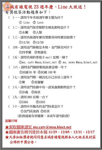 又來到歲末年終的感恩時刻,名城有線電視為歡慶23週年,感謝鄉親熱情的支持,今年將以「Line大放送」為主題舉辦有獎徵答活動,分享彼此的喜悅。「Line大放送!」有獎徵答活動,活動自即日起至12月20日截止收件,並將於12月26日上午九時舉行實況抽獎,獎項近千個,歡迎鄉親共襄盛舉、踴躍投件。 名城有線電視董事長許雪芳表示,名城週年慶是一份來自鄉親給予名城熱忱的感動,希望藉此「週年慶」活動彼此在這段時間有相同的話題、一起為了寄寫明信片而有所連結,把你我感情賴在(Line)小小明信片上,產生美好的共同記憶,名城團隊期盼台金各界共襄盛舉,讓鄉親藉明信片搭起愛的橋樑,預估今年將超過999個以上獎項,歡迎鄉親逗熱鬧。 今年週年慶系列活動,有「Line你」活動一,凡居住金門地區尚未安裝有線電視的住戶,自即日起至105年1月31日止申請裝機並預繳12個月以上收視費可享有免裝機費之優惠(原價$1,500元)。「Line你」活動二,舊客戶回娘家活動,舊客戶自即日起至105年1月31日止申請復機並預繳6個月以上收視費,即可享有免復機費之優惠(原價$1,500元),同時開放室外移機費之優惠活動。 「Line大放送!」有獎徵答活動,活動自即日起至12月20日截止收件,並將於12月26日上午九時舉行實況抽獎。 有關有獎徵答活動規則如下: 一、收件日期即日起至12月20日止截止收件(以郵戳為憑)。 二、題目採10題選擇題,答案以阿拉伯數字表示,題目全數答對者才可參加抽獎;並使用中華郵政標準明信片,請勿明信片後製加框邊,題庫可重複影印,在填妥答案後剪貼於明信片背後,逕寄至名城有線電視,地址為金門縣金寧鄉仁愛新村43號活動組收,請於明信片上註明,寄件人姓名、住址、E-mail、聯絡電話,以便於得獎後連繫。 三、若因答案有誤及上述資料填寫不明無法取得連繫或資料填寫不實者將視同放棄中獎權利。 四、參加有獎徵答的對象僅適用名城有線電視家庭收視戶(包含其同一戶籍之眷屬)。 五、每人限得獎一次,以第一次抽到的獎項為主。 六、活動規則及相關注意事項載明如上,參加者於參加本活動之同時,即同意接受本活動之相關規範。 七、得獎人必須於105年1月5日前帶著身分證或戶口名簿及印章等至名城有線電視領取,因配合扣繳憑單申報作業時間,請中獎者務必於期限內完成領獎,逾時將取消受領資格。 依中華民國稅法規定,得獎獎項價值超過新台幣1,000元者,應開立「各類所得扣繳暨免扣繳憑單」予得獎人,若獎項價值總額超過NTD$20,010元,將代扣10%稅額(非中華民國境內居住之個人依法扣繳20%之稅金)。得獎者須依所得稅法相關規定,申報綜合所得稅。代領者必需攜帶個人身分證、印章及得獎人身分證或戶口名簿及印章。 有獎徵答活動預定於12月26日上午9時至下午5時以現場實況轉播的方式公開抽獎,抽獎結束後將公佈於本報及名城33台活動節目重播。諮詢電話為(082)324942、312345或mail至mz.catv@msa.hinet.net索取題庫。 八、因應個資法,本活動所收集之客戶資料僅作為: 1.抽獎憑證。 2.領獎證明之用,領獎結束後二週內,所有明信片統一壓縮銷毀,不會留存。 九、凡參加「名城有線電視104年Line有獎徵答」活動之抽獎者,若中獎者視為同意將本人之姓名、村莊公佈於名城地方台與金門日報中獎公告,以利獲知中獎訊息。 相關獎項包括有:金酒55吋液晶電視一台、楊應雄立委42吋液晶電視一台、議會42吋液晶電視一台、省府32吋液晶電視一台、金城鎮公所32吋液晶電視一台、金防部32吋液晶電視一台、烈嶼鄉公所24吋液晶電視一台、金沙鎮公所電暖器三台、金沙鎮民代表會電暖器一台、金城鎮民代表會烘碗機一台、金寧鄉公所腳踏車一台、金湖鎮公所微波爐一台、金湖鎮民代表會烤箱二台、聖祖貢糖二十五份、上古厝麵線二十五份、喬安禮盒二十五份、林君志建築事務所二十四份、良金牛肉乾二十份、宏波陶瓷廠風獅爺撲滿二十份、峰上溫記賴家食堂香腸禮盒三十份、金合利鋼柄小切刀二十份、稅務局二十份、衛生局二十份、金瑞成竹葉貢糖二十份、小三通來回船票二十份、老農莊牛肉乾二十份、陳金福號貢糖二十份、太武之春彩品十二份、高坑牛肉店一條根牛鞭雞湯十二份、大河國際股份有限公司全聯禮券十份、洋露咖啡豆禮盒十份、穎創寶貝寵兒十份、翟家酸白菜十份、淳新高粱手工蛋捲十份、浯洲根彩品十份、梵果數位科技金門文創二十份、馬家麵線養生禮盒十份、風獅爺小城故事館十份、永強黑蒜頭禮盒五份、金管處五份、縣商會彩品五份、基恩精品五份、香蜂一條根禮盒三份、元大彩品兩份、華信航空單程機票四張、立榮航空單程機票四張、遠東航空單程機票四張、HBO實用組二十組、TVBS生活組二十組、Cinemax配件組二十組、人間衛視三好組二十組、八大偶像組十五組、霹靂典藏組十組、好消息豪小子組十組、大愛淨露組十組、年代簡約組十組、中天休閒組十二組、AXN應用組十組、CN探險活寶組十組、緯來球帽組十組、衛視星空組五組、VIVA美好組五組、NGC戶外組五組、迪士尼可愛組三組;歡喜獎:金酒組50組、HBO好康組100組等……彩品陸續增加中,以當日實況抽獎為主。