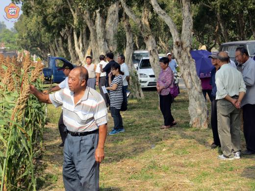 高粱新品種、農友新希望!農試所續於去年在金沙鎮後水頭村試種「豐糯2號」、「豐糯3號」高粱之後,今年於地區各雜糧產銷班擴大試種面積達11.5公頃,種植農友有陳鈞民、何盡忠、葉石生、楊能斌、陳有情、李坤洲、李再生七位,未來將推廣地區農友試種! 農試所表示,該年度農試所推廣地區農友試種新品種之高粱豐糯2號、3號,目前已進入採收期,為增加農友對新品種高粱之認知及明年擴大種植生產意願,特別於27日假農試所及金沙鎮第四雜糧產銷班舉辦高粱觀摩會,吸引金門地區農友及農會相關人員共計三十多人參加。 農試所指出,新品種高粱豐糯3號因植株較高,達二公尺上下,經聯合機收穫後,高粱穗尚有部分殘留於田間,但產量仍優於其他試種品種,目前已收穫產量豐糯2號的產量約為一公煩4,050-4,100公斤,豐糯3號則為一公頃4,400-4,500公斤。平均產量兩品種均高於目前栽培種台中五號的一公頃3,800-4,000公斤,且豐糯2、3號果實為紅色,比台中5號的白色子實較抗鳥害,風土適應性強,各種特性也較台中5號佳,試種農友反應熱烈,對二品種深具信心。 農試所所長楊慧明強調,該所今年另行引進一全糯性高粱新品種「豐糯4號」栽培,面積1.3公頃。 上揭三品系高粱,俟收穫完成請金酒公司,分別製酒試驗,以測試其品質。農試所預計在明年擴大八個試區之試種面積為100公頃,每試區種植豐糯2、3號及增加豐糯4號計3品種,以調查各項農藝特性及產量之穩定性,供全面推廣栽培之依據。