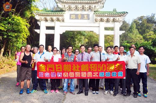 金門日報昨(30)日歡慶50周年社慶,除了中午有社慶聯誼餐會外,本報員工也由經理黃克標帶隊,早上到太武山登山健行,下午則是到植物園進行環境教育講習,讓報社同仁聯繫情感,度過社慶充實的一天。 昨日早上8點多,本報同仁約30人便來到太武山登山步道玉章路口處集合,大家精神飽滿、神采奕奕,準備開始登山活動;出發前,本報社長許一傑與經理黃克標也和同仁們在玉章路牌坊合影留念。一路上大家有說有笑,慢慢走到太武山上海印寺,海印寺住持釋性海大師知曉報社同仁來訪,更專程從山下祈福法會現場趕回寺內迎接,大夥相談甚歡。 本報同仁中午社慶聯誼餐會用完餐後,便移往植物園區聽取環境教育講習,一整天的社慶活動有動態運動也有靜態講座,多采多姿。本報經理黃克標表示,金門日報走過半世紀,實屬難能可貴,舉辦社慶登山活動與環境教育講習,為的是讓報社同仁們到戶外踏青透透氣,增進員工們彼此之間感情,團結報社每一份子,凝聚大家的向心力,讓金門日報邁向下一個50年。