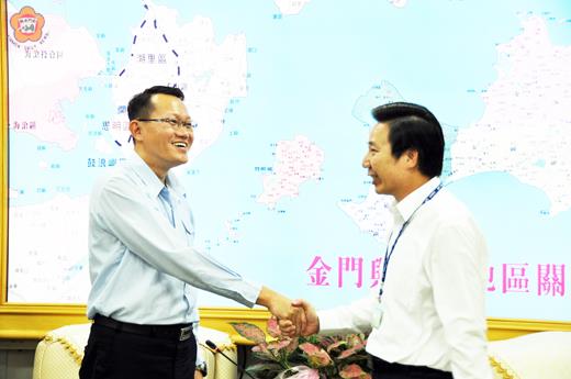 金門岸巡總隊總隊長曲立斌即將榮調到基隆服務,昨日下午並專程到金門縣政府向縣長陳福海辭行,陳縣長對於曲總隊長為金門做了很多事表示肯定,並以兩岸氛圍有必要多接觸,來協商約束越界捕漁和抽砂。 曲立斌昨日下午四時二十分許偕同副總隊長吳建冠,於拜會縣長陳福海時,建設處長許志忠也在場作陪。 曲立斌對於縣長十個月多以來,對岸巡總隊的照顧表達感謝之意;也歡迎縣長撥冗到基隆走走。對此,陳縣長也以原金門國家公園管理處長林永發,現在是基隆市副市長,有空會前去拜會這些老朋友。