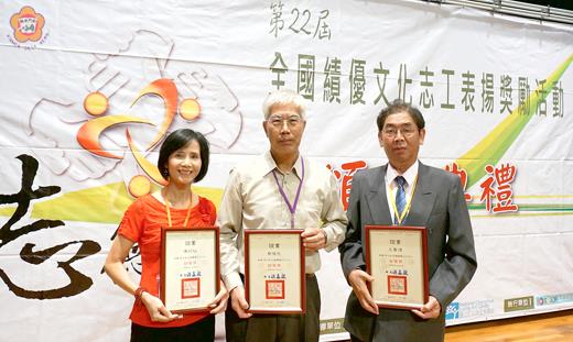 由文化部主辦的第二十二屆全國績優文化志工表揚活動,昨日假台北舉辦頒獎典禮,文化局志工王賢德、蔡發色、陳彩仙,在文化局推薦下從全國眾多優秀的競爭者中脫穎而出,分別榮獲金質、銀質、銅質獎,實屬不易,這也是文化志工隊自九十七年後再次榮獲金質獎章。文化局局長呂坤和表示,金門文化藝術因為這群志工的無私付出才能日漸茁壯。 由文化部所主辦,國立彰化生活美學館承辦之「第22屆全國績優文化志工表揚活動」頒獎典禮,昨日假台北市公務人力發展中心福華國際文教會館2F卓越堂盛大舉行。該績優文化志工經過初審、複審、面試、決審等自全國選拔出十位金質獎、三十位銀質獎、五十位銅質獎得主,金門文化局推荐三位文化志工角逐該獎項,其中王賢德獲得金質獎,蔡發色獲得銀質獎,陳彩仙獲得銅質獎,相當不易。 三位獲獎志工昨在文化局局長呂坤和陪同下赴台領獎,並自文化部次長許秋煌手中接過獎項。呂坤和表示,恭喜三位志工榮獲全國績優志工獎肯定,尤其王賢德榮獲全國僅有十名的金質獎。藉以也特別鼓勵志工們見賢思齊,服務人群,利人利己。呂局長也表示,金門的文化藝術因為有這一群可愛無私的志工才能日漸茁壯。文化志工很久沒有招收新血,今年已新招幕十六位成員,希望之前離開的志工歸隊,或有興趣的大家都能踴躍加入,一起為金門的文化藝術推廣盡一份心力。