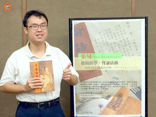 家中重視讀經教育,自幼背誦經書,金門大學華文系二年級學生張易,23日在文化局「推廣經學背誦活動」中,以一小時二十分鐘時間背完整部論語,贏得滿堂彩。文化局局長呂坤和表示,古人云:「半部論語治天下」,融會貫通可修身、治國,文化局積極提倡讀經教育,期藉以輔導小朋友從背誦詩詞經典中,認識中國文化之美。 為推廣經學背誦,感恩慶祝至聖先師孔子聖誕,金門縣文化局原訂於九月二十八日,上午假浯江書院舉辦「推廣經學、背誦活動」,受颱風影響延期至前天舉行。於下午二時起假文化局三樓會議室舉辦,計有三十餘位中正國小學子到場聆聽,國立金門大學華文系二年級學生張易,歷時一小時二十分完整背誦整部論語,與會民眾及學子紛紛豎起大姆指稱許其功夫下得深,並贏得如得掌聲。 金門縣文化局指出,《論語》是孔子弟子編輯的一本書,共有二十篇。每篇錄有二、三十節孔子與弟子之間的對話,或是孔子的行為事跡,內容生動豐富。而孔子心中的政治觀、人生觀,就在這些生動的對話中展示出來,這些觀念也在中國歷史上產生了深遠的影響。故希望透過此推廣活動,更能親近孔子思想,進而運用於生活之中,領悟不同人生智慧,並體驗閱讀論語的樂趣。 今年十九歲家住高雄的張易,因父母親重視讀經教育,家裡小孩都被要求背誦四書五經。他小一開始先背誦《老子》、《論語》、《詩經》,到高中背《周易》及一些詩詞,但他還是喜歡經書,幾乎都達以背到滾瓜爛熟地步。原就讀金大國際暨大陸事務學系夜間部,大二才插班華語文學系,如願進入他最喜歡的科系就讀,由於這樣的背景他寫EMAIL給文化局,希望能推廣經學背誦活動。 張易從論語第一編學而篇,一口氣背到第十四編憲問篇,歷時一小時,經中場休息十分鐘,再從第十五編衛靈公篇背到第二十編堯日篇,花掉二十分鐘,一小時二十分鐘背完整部論語,博滿堂彩。張易指出,他不僅歷時準備,壓力也相當大,還好從小打下深厚基礎,順利完成。他希望能吸引更多小學生、家長喜歡上讀經之美,也藉此弘揚儒學。 文化局長呂坤和也到場鼓勵並表示,古人常說:「半部論語治天下」,熟讀、讀通論語可以修身、齊家、治國、平天下。過去小孩讀私塾被要求死背經書,小朋友在記憶力最好時背誦雖不知其意,但長大後就會慢慢理解且融會貫通。文化局也積極提倡讀經教育,希望讓小朋友透過讀經自幼認識中國文化之美。