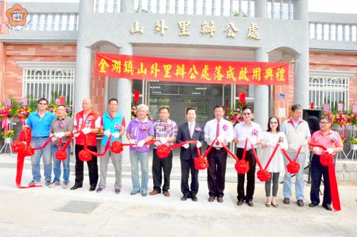 斥資約新台幣一千萬元,歷時近一年的施工興建,位於金湖鎮轄內的山外里辦公處新建工程昨(廿四)日舉行落成啟用典禮;金門縣長陳福海和縣府官員、縣議員、金湖鎮長蔡西湖和鎮代表、村里長、里民到場觀禮。陳縣長除與蔡西湖等人共同主持剪綵,並致贈書有「服務鄉梓」綵匾一方祝賀;同時,對於上任縣長十個多月來,陳縣長感謝鄉親的支持,他也會努力做好縣務施政建設工作! 金湖鎮山外里辦公處落成啟用典禮昨日上午十時隆重舉行,在祥獅獻瑞和志工媽媽精彩表演揭開序幕;陳縣長和民政處長王中聖、行政處長陳世保、衛生局長陳天順;縣議員陳滄江、李應文;金湖鎮長蔡西湖、鎮代會主席呂瑞泰和副主席李秀華、鎮代表陳向鑫、陳水德,以及多位里長到場與山外里民一起觀禮。 新建的山外里辦公處造價近千萬,接近市區,地點十分便利,將是里民洽公和舉辦活動的好地方。其啟用典禮主人之一的山外里長陳晚開是一位不善於言詞,但勤於為民服務;他的致詞很簡短,陳晚開說「感謝大家逗陣來逗熱烈,謝謝」,展現他「少說多做」的樸實從政態度。 縣長陳福海致贈「服務鄉梓」綵匾一方,祝賀山外里辦公處落成啟用;陳縣長致詞時,他稱山外里里長陳晚開為「阿開叔公」不太善於言詞,但很會做事情,默默的付出,會給人感動;但「阿開叔公」也很有頭腦,把里辦公處規劃得很有「前瞻性」和願景。 陳縣長與金湖鎮長蔡西湖、鎮代會主席呂瑞泰、山外里長陳晚開、縣議員陳滄江和李應文等人共同剪綵。陳縣長說,有五星級的縣長,也要有六星級的鎮長(現場響起一片掌聲);對於上任十個多月來,他感謝鄉親的支持,也會努力去做好縣務施政建設工作! 金湖鎮務施政建設和發展,陳縣長表示,有好的鎮長,以及鎮代會、縣議員的支持,縣府在預算上會全力來支持,促進鎮務進步。至於山外里辦公處落成啟用,陳縣長也希望加強內部軟體設施,提供鄉親來使用,提升健康、休閒生活的品質。 此外,陳縣長也介紹行政處長陳世保、民政處長王中聖給山外里民認識外,他也向里民報告說明山外都市計劃推動步驟,也會配合地方意見;同時,陳縣長表示,金湖鎮有它發展的條件,如軍艦博物館規劃,讓遊客來到金門一定要到金湖;除此之外,金湖鎮也要有東西可以給人家看,鎮公所在規劃,縣府支持將金湖觀光建設做好。最後,陳縣長也祝福金湖鎮鎮運欣欣向榮。 山外里辦公處為一樓新建工程,內部相當寬敞,並配合里民會議和活動需求規劃。金湖鎮長蔡西湖表示,從落成啟用典禮有那麼多鄉親到場參與觀禮,就可看出山外里里長陳晚開的用心和努力;同時也希望藉此讓大家都知道公部門在做很多事情,並藉山外里喜事,蔡西湖以感恩的心,他感謝縣長陳福海和鎮代會、縣議員的協助支持,才讓其辦公處興建落成啟用,提供里民一處友善的洽公和活動的地方。 蔡西湖強調說,自當選就任金湖鎮長以來,就有一個心願「希望住在這塊土地的所有鄉親、長輩、好朋友們,生活品質越來越好,生活空間、環境也越來越好!」如何去做會更好?蔡西湖指出,鄉鎮的地方政府沒有預算,都必需仰賴縣政府,以及鎮代表會的全力支持,讓鎮公所團隊可以朝此一目標來前進。 蔡西湖也表示鄉親對於鎮務施政建議,他是可以聽得見、聽得進去的,並舉一年前山外里辦公處規劃時,就是尊重里民想要的辦公處,並朝此方向去做;今天啟用後,山外里辦公處可以是多功能的使用,不僅僅是里辦公處而已,提供鄉親需求的友善環境和處所。 金湖鎮代會主席呂瑞泰表示,山外里辦公處今天啟用,最開心的莫過於里長陳晚開了,笑靨像太陽一樣燦爛;而且,他相信從里辦公處開工第一天起,陳晚開天天都在做監工主任,非常的認真、盡職,是值得敬佩的地方。同時,呂瑞泰也感謝陳縣長對金湖的支持,相信未來金湖的建設發展,一定會突飛猛進,增進東西半島的平衡發展,明天一定比今天更美好! 縣議員陳滄江致賀詞時,他以「不分區議員」來自稱,鄉親若是「有差甲」叫得到,看得到;做不好的,也罵得到;所以,隨傳隨到,說到做到。同時,陳滄江說,一年前來參加里辦公處開工典禮,今天已興建落成啟用,真的很快;辦公處內部設施,縣議會也會挺到底! 縣議員李應文說,他到山外里辦公處參觀,看一看,里長陳晚開說設施不夠,李應文說「不要緊」,當場允諾出十萬元的配合款,以作為內部設備的經費,並指出有要做的,直接撥下去就好了,贏得在場里民的熱烈掌聲和感謝! 金湖鎮山外里辦公處整個落成啟用典禮,於剪綵之後,有參觀里辦公處,以及美食品嚐活動,歷時約一個小時,始圓滿告一段落。