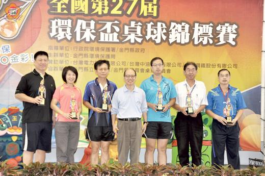 一連三天在金門縣立體育館舉辦的第27屆全國環保盃桌球錦標賽,昨日上午十一時由環保署副署長符樹強主持頒獎閉幕典禮後,大家並相約明年在南投縣再見。 閉幕典禮中,除了來自全國各縣市政府及相關單位的環保人員參加外,縣議員陳滄江、金城鎮長石兆瑉、金門縣環保局長傅豫東等,也都到場觀禮、參與。 環保署副署長符樹強也感謝金門縣政府及金門縣環保局為此次全國環保盃桌球錦標賽在金門舉辦的動員付出,希望環保人員在感受金門熱情與好山好水絕不無聊後,於回到工作崗位能為消除登革熱孳生源、溫室氣體減碳作為等繼續努力。 第27屆全國環保盃桌球錦標賽 ,昨日上午圓滿閉幕,賽程結果為,團體男子甲組:第1名為桃園縣政府環境保護局、第2名為台北市政府環境保護局、第3名為澎湖縣政府環境保護局、第4名為中國鋼鐵股份有限公司、第5名為新北市政府環境保護局、第6名為台中市政府環境保護局。團體男子乙組:第1名為高雄市政府環境保護局、第2名為台南市政府環境保護局、第3名為嘉義縣環境保護局、第4名為新竹縣政府環境保護局、第5名為台灣電力股份有限公司、第6名為行政院環境督察總隊中區環境督察大隊、第7名為基隆市環境保護局、第8名為苗栗縣政府環境保護局。團體女子組:第1名為桃園市政府環境保護局紅隊、第2名為台北市政府環境保護局、第3名為桃園市政府環境保護局白隊、第4名為台灣電力股份有限公司、第5名為行政院環境保護署環境督察總隊、第6名為行政院環境保護署、第7名為基隆市環境保護局、第8名台南市政府環境保護局。 地主隊金門縣環保局雖於首輪比賽即以2敗1勝之戰績未能進入決賽,局長傅豫東表示,此次由金門縣辦理環保盃桌球賽,環保局動員全部人力籌備半年時間,能把活動辦的盡善盡美就是最大的贏家。是否能把獎盃留在金門就不是那麼重要了,也期待這次活動各參加人員都能感到賓至如歸,不虛此行。而這次的活動也只是序曲,金門有太多的文化及故事等著大家一起來分享及體驗。 今年的環保盃桌球錦標賽由金門縣環保局承辦,十五日起至十七日在縣立體育館展開為期三天的賽程,這是27屆的環保盃桌球賽以來,首次在離島縣市辦理比賽。 這項由環保署與金門縣環保局共同舉辦的全國環保盃桌球錦標賽,其目的期望藉由全國環保盃桌球錦標賽展現環保同仁的熱情與活力,激勵同仁共同參與之榮譽感,促進各級環保人員情感交流,凝聚全國環保人員的向心力,鍛鍊員工強健體魄,發揮團隊精神,以達提昇工作效率為目的,俾利推動各項環保業務。 這項比賽計有首長組有11人參賽,團體男子甲組有6隊、團體男子乙組17隊、團體女子組11隊,首長組、團體男子甲組取前6名,團體男子乙組、團體女子組取前8名,發給獎盃、獎牌,並從績優隊伍選出最佳隊伍頒發精神總錦標一座。 今年的比賽由金門縣體育會桌球委員會協助,在專業裁判及桌球委員協助監督下,賽程流暢順利,參賽單位除了環保署及所屬機關、各縣市環保局及所屬單位人員外,還有台灣中油公司、台灣電力公司、中國鋼鐵公司代表隊參賽。