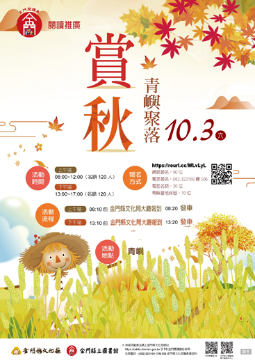 金門縣文化局為推動金門閱讀島,辦理「四季走讀~走讀最美的村庄-走春、戀夏、賞秋、藏冬」閱讀推廣活動系列一賞秋:青嶼,將於109年10月3日登場。活動詳情請上金門閱讀島FB,文化局誠摯邀請鄉親參與,多走出戶外感受家鄉傳統建築之美。 「四季走讀~走讀最美的村庄」系列活動-賞秋:青嶼,共舉辦兩梯次,第一梯10月3日上午,第二梯10月3日下午,活動時間上午梯次為08:00至12:00,錄取參加人員請於8:10前於文化局大門口辦理報到,08:20準時搭乘遊覽車出發;下午梯次為13:00至17:00時,參加人員請於13:10於文化局大門口辦理報到,13:20準時搭乘遊覽車出發(敬請準時,逾時不候)。 賞秋路線規劃為:縣定古蹟前甲張氏宗祠→縣定古蹟張氏兄弟洋樓→褒忠坊遺蹟→金山道殿→重恩堂,甲庚寅申厝,子午厝→海龍部隊駐地(洋樓)→張氏家廟→張敏紀念公園→張敏衣冠塚→草嶼。將邀請黃振良、陳炳容、陳成基等在地知名文史工作者,擔任隨隊沿途講解,機會難得,敬請民眾踴躍報名。因新冠肺炎疫情尚未完全解除,參與民眾仍需帶口罩及注意防疫事宜。 報名時間:9月26日早上九點開放報名,每梯次各限額120人,本次活動90位採用網路報名,30位受理電話報名,恕不受理現場及傳真報名,對象限幼兒園(含)以上民眾報名參加,學童需有家長陪伴,每人限報一梯,不得重複報名,上網報名一次只能報名四位,若採網路報名請上金門縣文化局網站-閱讀推廣:報名網址:https://reurl.cc/WLvLyL。採電話報名專線則為:082-323169轉506。 青嶼位在天摩山之陽,西、北兩面隔著高阜與官澳為鄰,東面是海,海面有一小嶼名為「草嶼」,南面是大片低平沃野,隔著這片沃野與山西為鄰,地勢自西北往東南傾斜,這片廣闊的平地,大部分是強勁東北季風將海灘的砂塵帶來所形成,從青嶼至山西間的海岸,延伸到沙尾一帶,青嶼村拓建至今已有七百年以上歷史,目前有五十多戶人家,其中張氏約佔九成,張姓始遷祖張均正於宋末自晉江張林卜居此地,明初四世孫必宜因避倭亂,移居同安東園繁衍成族。
