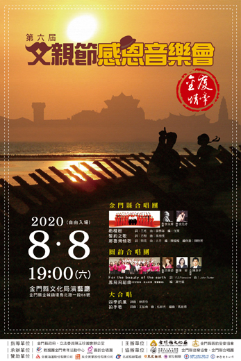 2020第六屆父親節感恩音樂會-金廈情牽,今年邀請了台灣原聲童聲合唱團,與在地的金門縣合唱團及圓韵合唱團,共同於8月8日晚間7時於金門縣文化局演藝廳,用歌聲來祝福普天下的父親們佳節快樂! 緣起於六年前與廈門鳳凰花合唱團的跨海合作,今年由於疫情關係,鳳凰花合唱團無法前來,但為了與金門縣合唱團、圓韵合唱團的情誼,拜科技之賜,鳳凰花合唱團仍錄製了創作歌謠〈阿爸的小木船〉、〈父愛如山〉的影帶,不缺席的同來慶賀,讓這次的父親節感恩音樂會更加精彩鮮活;加上享譽國際的台灣原聲童聲合唱團的參與演出、光仁中學洪雪卿主任的導聆,為音樂會注入驚艷元素,表演精彩可期。 這一場由金門縣文化局、金門縣圓韵愛樂協會主辦,金門青年活動中心承辦的《2020第六屆父親節感恩音樂會》,將為地區鄉民帶來一大福音,由台灣原聲童聲合唱團、金門縣合唱團、圓韵合唱團同台歌頌父愛如山、親恩似海的美聲旋律,一起譜出感恩樂章,用歌聲來表達心中誠摯的祝福。 金門縣合唱團乃金門縣文化局所大力扶植的優質社團,具有悠久之歷史,除了積極於地區音樂活動之推展,更踴躍投入兩岸三地的音樂交流活動,並參與國內外歌唱大賽獲獎無數,將金門的音樂藝術發揚光大,宣揚金門聲威,備受歷任縣長之肯定,誇讚為金門之光! 圓韵合唱團以「圓少年合唱夢,譜金門新音韻」自許,於105年正式登記成立。今年,在榮譽團長楊肅元的大力促成下,由金門縣圓韵愛樂協會積極籌劃在擎天廳舉辦一場「金門禮讚-敬軍音樂會」。 今年邀請了來自玉山星空下的台灣原聲童聲合唱團,在指揮馬彼得校長的帶領下,第一次來到離島獻唱。原聲團員的歌聲來自心靈深處,清澈、純淨又和諧,宛如天籟,小小年紀已身經百戰,歷經國慶禮讚、國慶國歌領唱、國家音樂廳、世界童聲合唱節、高雄市運到上海世博,以及歐、美、日、陸的巡迴演唱。