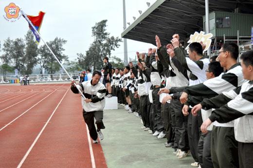 楊水詠/圖文 金門縣第十七屆運動會軍中男五千公尺決賽,昨天下午登場,總共有來自各部隊八位中長距離長跑健將參加,同場比較體魄、耐力和速度,爭取前四名,為自己的所屬部隊爭榮譽。圖為神獅(砲兵群)部隊全體弟兄,帶著隊旗,以堅實的陣容,揮舞隊旗,為自己隊上參賽選手加油,鼓舞士氣,展現了團結、榮譽和同袍之情的最高精神。