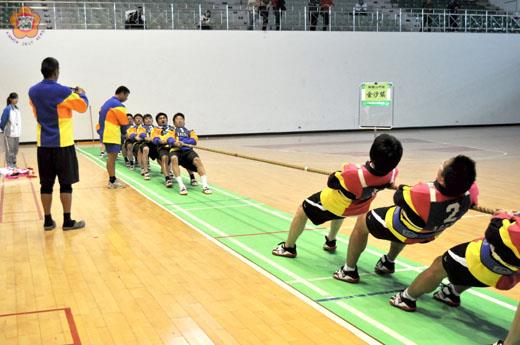 金門縣第十七屆運動會拔河比賽,昨日在金門縣立體育館熱鬧舉辦,實力雄厚的消防局、金沙鎮公所、金東守備隊,分別拔得機關組、鄉鎮組、軍中組的冠軍。 本屆縣運會拔河比賽計分三組參賽,機關組有縣政府、消防局、警察局、金酒公司四隊參加,鄉鎮組有金城鎮、金湖鎮、金沙鎮、金寧鄉、烈嶼鄉五隊,軍中組有金東守備隊、金西守備隊、砲兵群、烈嶼指揮部等四支隊伍共襄盛舉。 昨日在縣立體育館內的拔河比賽承辦單位管制會場進出,觀眾在體育館二樓看台觀賽或加油,比賽隊伍則在一樓的場地進行比賽。比賽採雙敗淘汰制,各隊伍領隊都到場親自督陣為隊員加油鼓勵,參與單位同仁也到場加油助陣,尤其是參與的軍中弟兄全體到場為隊友鼓舞士氣,展現訓練有素的紀律,現場氣氛熱鬧滾滾。 在各場的比賽中如遭遇到勢均力敵的對手,苦戰中拉拔最耗費體力,而技術與肌耐力也會成取勝的關鍵,而碰到實力懸殊的,則一路輕鬆過關斬將,以直落二的勝績挺進,比賽中各隊平日練習的成果表露無遺。 昨日比賽中雖然也曾發生了機關組金酒公司對於對手消防局換將的爭議外,但整個比賽也都能順利進行,實力雄厚的金沙鎮連戰皆捷再度蟬聯登上冠軍寶座,而消防局展現技術與體力在機關組封王,也報了前年的一箭之仇(第十六屆縣運會冠軍為金酒公司、消防局屈居亞軍)。而金東守備隊也以堅強的實力,在軍中組稱雄。 多年來積極推展地區八人拔河運動的金門大學學務長董燊教授指出,今年的拔河比賽,鄉鎮組、機關組實力都比往年好,實力都在伯仲之間,也證明地區拔河運動已逐步生根推展中,尤其是比賽中各鄉鎮鄉鎮長甚至鄉鎮代表會主席,或參加機關首長也到場為球員鼓舞士氣,顯示單位主官的重視是提昇整體運動戰力的最大因素。 縣運會拔河比賽經過昨日激烈競拔後,成績當場揭曉,鄉鎮組第一名為金沙鎮,第二名金城鎮,第三名金寧鄉(一至三名排名與上一屆縣運會一樣)。機關組第一名為消防局、第二名金酒公司、第三名警察局。軍中組第一名為金東守備隊、第二名金西守備隊、第三名砲兵群。