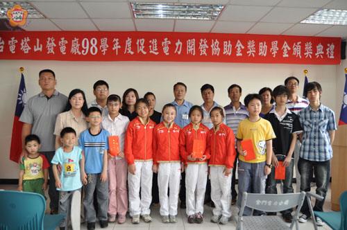 台灣電力公司塔山發電廠昨日頒發金門地區「促進電力開發協助金獎助學金」獲獎學生,計有三百四十人及六隊才藝優秀團體得獎,發放的獎助學金總額達到新台幣四十萬元;塔山發電廠廠長李清德祝賀得獎的學生及才藝團體,肯定他們的努力與耕耘,期勉獲獎的學生要好好的珍惜,事業有成之時,也能夠回饋社會、照顧貧困的學子。也呼籲鄉親能夠以具體的行動來落實節約能源的政策。 九十八學年度台灣電力公司金門地區「促進電力開發協助金獎助學金」的頒獎典禮,昨天上午九時在塔山發電廠一樓簡報室舉行,由塔山發電廠廠長李清德主持;今年得獎學生人數共三百四十人及六隊才藝優秀團體受益;塔山發電廠廠長李清德在頒獎典禮上祝賀得獎的學生及才藝團體,肯定他們的努力與耕耘。 隨後,即進行頒獎的典禮,由李清德廠長頒發各組獲獎的學生,學業優秀組獎學金:國小組共二百名,每人各得獎學金五百元。中正國小六十名、賢庵國小十二名、金湖國小五十九名、正義、開瑄、柏村等國小各九名,多年三名、卓環十二名、西口六名、上岐三名。國中組八十九名各得獎學金一千元,金城國中五十七名、金湖國中廿五名、烈嶼國中七名;高中組,金門高中二十一人各得獎學金二千元;專科高職組九人各得獎學金二千元;大學組十人各得獎學金五千元。才藝優秀團體組六隊,各隊得獎學金六千元。