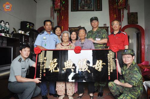 國防部為弘揚母儀典範,辦理國軍模範母親表揚活動,居住昔果山的周翁森孚含辛茹苦地撫養子女長大成人,並鼓勵子女投身軍旅,有優異的表現,獲選為模範母親,金門防衛指揮部副參謀長楊迺聲帶著國防部長高華柱贈送的賀匾、禮品,向這位慈母致意。金寧鄉長陳成勇也表達道賀之意。 陳成勇獲悉鄉民周翁森孚老太太獲選為國軍模範母親的殊榮,也是地區唯一獲國防部表揚的模範母親,昨日一大早,在鄉公所秘書傅仰鑫陪同下,登門向周老太太和家人道賀。陳成勇說,周老太太辛苦撫育子女成家立業,其子周興旺,服務國防部北部軍事法院檢察署看守所、和擔任金酒公司技術工程師周興邦,表現優異,讓母親引以為榮,該項榮譽也是周家子女送給母親最好的母親節禮物。 國防部長高華柱很重視該項模範母親的表揚,原本要親自來金門表揚高齡八十二歲的周翁森孚,感謝國軍官兵母親無怨無悔,為國育才的辛勞,但因臨時有公務,雖然無法當面向這位慈母表達敬意,也要求金防部要慎重其事代為致意。 金防部副參謀長楊迺聲由國防部南部地方軍事法院檢察署金門辦公室主任檢察官謝天來等人陪同下,前往昔果山轉頒賀匾、禮品與慰問金,周興旺和姊姊周寶惠、周寶貝、妹妹周麗端一家人喜悅的分享母親得獎的榮譽。周興旺的年邁八十八歲姑姑周素田也前來一沾喜氣,高興弟媳一生的辛苦和付出,有所代價,也是周家的榮譽。 周翁森孚老太太開心的接受該項榮譽,喜悅的是子孫都很孝順,也是她一生最珍貴的禮物。 楊迺聲說,要獲得該項榮譽是很不容易,周老太太自幼家境清寒送予夫家當童養媳,困於經濟因素無法同一般人正常求學,雖目不識字然保有中國婦女三從四德,刻苦耐勞的傳統美德。他說,周家係靠捕魚、農耕及養畜維生,時值對日抗戰時期,魚貨、農作物更形缺乏,周翁森孚不但要照顧年邁的公婆外,亦需幫忙家計;又歷經八二三砲戰,每每遭逢空襲躲防空洞度日,緊衣縮食幾乎是家常便飯,尤其在子女陸續出生後,更彰顯母愛的光輝,寧可自己省吃儉用,將全部心力投注於下一代的照顧。禍不單行的是子女在未成年時,丈夫因經年辛勞養家於民國六十六年病逝,留下七名子女,長女十七歲,幼子僅八歲,遽然家中重擔全落在周母肩上,除要照顧年邁之公婆,亦需身兼父職,含辛茹苦教養子女成長。惟家庭經濟實在不允許子女繼續升學教育,此乃周母心中抱憾之事,但子女們亦能體會母親的辛勞及家中的困苦,長女、次女國小未畢業即輟學,輔助母親照顧弟妹及分擔家計,其他子女則是利用半工半讀的方式努力完成學業,令周母欣慰的是,子女在台灣及金門均有正當的工作與職業。 楊迺聲也推許周興旺在軍旅的優異表現,是資深的一等士官長,曾獲頒忠勤勳章二枚、三大功獎章八枚、軍種優良互助組長楷模表揚暨八一四空軍楷模等事蹟,無非是周母諄諄教誨之功。
