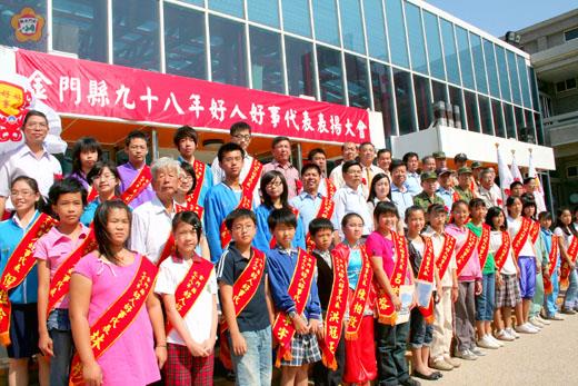 好人不要寂寞,好事要傳千里!金門縣陳永棋、王傅憲、許異揚、許傑銘、李宇澤等四十八位好人好事代表,昨天在社福館接受頒獎表揚。 金門縣長李炷烽在表揚大會中說:好人好事的選拔,有嚴謹的過程,希望社會大眾對他們的努力與貢獻能夠見賢思齊,做到有「為者亦若是」;大家「存好心,說好話,做好事」,移風易俗,淨化社會。 出席表揚大會者,除了好人好事代表、金門縣長李炷烽之外,還有金防部政戰主任黃慶靈、金門縣表揚好人好事運動協會理事長王添泉、金門縣政府各局室主管、各鎮鎮長及民代、各校校長。 金防部政戰主任黃慶靈在表揚大會中說:好人不要寂寞,好事要傳千里!過去的美德是為善不欲人知,現在則需要藉由好人好事的傳播,讓社會更和諧、更美好。 黃慶靈引用已故法鼓山創辦人聖嚴法師的話說:「讓別人快樂是慈悲,讓自己快樂是智慧」;希望人人日行一善,讓自己既有慈悲、又有智慧。 今年由金門縣表揚好人好事運動協會評選出來的好人好事代表中,有社會人士三位,他們是:陳永棋、林莘恭、黃延慶。 陳永棋常協助推動生態教育工作;林莘恭在民國五十五年曾持鄉長李漢秋公函,向僑民籌募一百多萬元,推動建校;黃延慶在推動及執行社區關懷據點的工作上,顯有績效。陳永棋期待集合大家的力量,一起做好人做好事。 獲表揚的五位軍方代表中,地支部上校指揮官陳立中曾辦理社區義診及獨居老人送餐服務;烈嶼指揮部政綜科少校心輔官方明光曾參與淨灘、植樹活動;空基隊上校指揮官解林曾經參與直昇機失事搶救任務;海指部上校指揮官唐義生曾支援社區環保活動;戰車營戰二連上尉連長周欣頤曾協助社區鏟除毒草。 三位獲表揚的金門技術學院學生中,王傅憲曾利用假日輔導中小學生;林翊安常在校外擔任志工;羅伊真曾協助教會辦理品格才藝營。羅伊真的得獎感言是:「助人為快樂之本」! 獲表揚的六位高中職生中,金門高中許翼揚、葉雅妮、黃家琳藉由樂團的經營管理,讓音樂之美可以在校內校外發揚;金門農工楊至柔曾背負同學接受救護,張芷萁是每屆運動會及每次段考的「救護員」,蔡雅惠常擔任幹部提供服務。對許翼揚而言,做好事就是要做到認真、積極。 被表揚的八位國中生包括:城中許傑銘、郭姮彤、倪佳鈴、湖中鄭博軒、翁雅萱、沙中張綺驛、寧中徐敏翎、烈中楊鈴如。倪佳鈴常以真誠及笑容待人;張綺驛說:有能力幫人就應該幫到底! 被表揚的二十三位國小學童是:中正國小李宇澤、許晉豪、熊苡甯、湖小洪菱、呂沛蓉、卓環蔡紫儀、上岐洪冠正、西口林宣彤、寧中小楊佩涵、古寧李靜、金鼎陳柏孜、湖埔楊皓瑋、古城黃孝蓉、賢庵陳盈蓉、垵湖分校吳國榮、沙小黃心怡、述美楊采薇、何浦王芷菱、安瀾李昀、多年呂芯卉、正義蔡詩淳、柏村鄭佳欣、開瑄陳佑池。 上述的學童,大多是父母及老師、同學的好幫手。其中,黃心怡堅強地與母親、哥哥為生活而奮鬥,期待將來能與父親團聚。李靜對於班上學習遲緩的同學,能主動給予協助。許晉豪曾經拾金不昧。