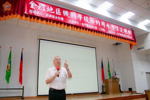 金門縣愛護水資源協會與金門自來水廠昨日邀集本縣機關學校、社區加強宣導節約用水,並邀請水利署等專家學者蒞金開講,講授相關節水措施與作法,希望從機關團體的個人做起,大家一起努力做好各項節水、省水措施,達到「愛水是功德、節水是積德」。 是項說明會於昨日上午九時假金門縣自來水廠三樓視聽室舉行,金門自來水廠廠長翁自保、金門縣愛護水資源協會理事長張雲羽、經濟部水利署保育事業組副組長謝瑞文、經濟部工研院研究員王先登等人與各機關學校社區代表一百五十多人到場參加。 張雲羽表示,金門離島的水資源十分有限,加上水庫的數量又不多,長久往後持續下去,可能會經常面臨缺水危機,他說,目前包括澎湖與馬祖等離島都曾因為缺水而從台灣本島運水,可是成本相當高,一度就要好幾百元;先前地區也有提出從大陸接水,但是又卡在中央政策問題,一直無法上路施行。 張雲羽說,希望金門民眾能體會水資源得之不易,大家能珍惜用水,並努力於各項節水措施,讓地區的水資源能永續利用。 翁自保昨也以「金門地區近三年推動節約用水之績效與未來作法」為題開講,他指出,水廠推動的節約用水作法,包括:透過各項管道積極宣導節約用水的觀念、為機關及家庭用戶免費換裝省水器材、辦理老舊管線汰換、公共給水GIS管網資訊系統之運用、水塔配水穩定水壓減少漏水、辦理水資源回收再利用,及倡導家戶使用省水器材、鼓勵機關學校興建雨水儲留設施、辦理家戶水錶逾齡汰換、校正供水站計量計、加強竊水情形稽查等。而水廠節水措施在具體績效上,每年漏水量由93年298萬噸降為97年的漏水量130.8萬噸,以97年每度售水成本51.14元計算,每年減少漏水損失8550萬6080元,成效卓著。