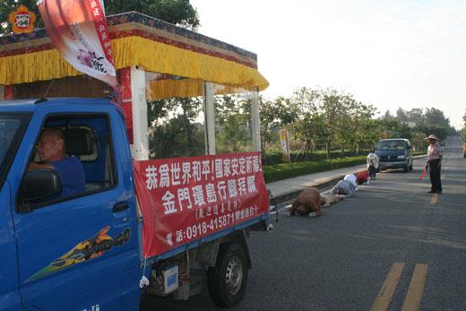 紀念古寧頭戰役60週年,惟悟法師展開金門環島行腳,昨日,惟悟法師帶領信徒行腳到古寧頭,從慈湖到頂堡圓環路段,沿途三步一跪拜祈福,期消災解厄,金門永離戰爭災禍。 來自台北蘆洲的惟悟法師表示,他是受金門縣佛教會理事長性海法師邀請來金門參與「金門地區第三次圓滿水陸大法會」,也是紀念古寧頭戰役60週年的活動之一,他要用行腳來祈福,安慰戰爭的亡魂,也為兩岸和平祈福。