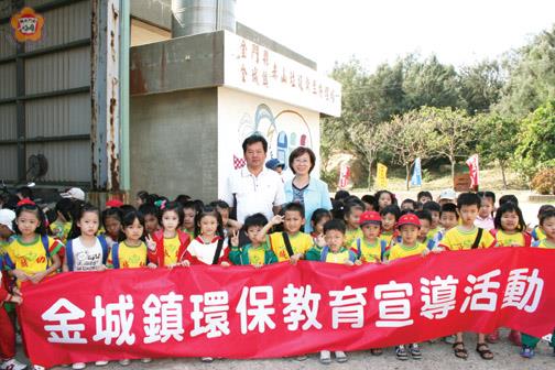 配合九年一貫教學單元課程,昨日近三百名學童在金城幼稚園園長盧淑惠帶領下,前往金城鎮赤山衛生掩埋場舉辦校外教學活動,並參觀衛生掩埋場操作情形及復育公園,鎮長蔡輝詩率同環保課長陳水友接待、解說,讓小朋友們了解每日產生的龐大垃圾,經過許多清潔人員、動用車輛、機械才清理完成的,期盼小朋友做個環保小尖兵,把環保觀念帶回家裡,讓未來的生活環境更美好。 當小朋友們來垃圾場復育公園參觀時,看見現場綠草如茵、花木扶疏,植栽復育良好,一聽到公園是由垃圾掩埋場復育,腳踩的土地埋的是堆積如山垃圾,各個睜大眼睛,驚嘆聲四起,也對於鎮公所長期推動垃圾場復育工作留下深刻印象。 鎮長蔡輝詩也引領著小朋友參觀資源回收場和掩埋場,蔡鎮長說,近年來金城鎮強力推行「垃圾減量」和「資源回收」的工作,並實地參觀資源回收的各項成果,包括:海蚵殼粉碎、玻璃瓶粉碎、保麗龍熱熔、鐵鋁罐壓縮及各項細分選工作。據鎮長蔡輝詩表示:赤山垃圾衛生掩埋場於八十九年啟用時原本預定使用五年的使用壽命,已經成功的延長,若能再獲得環保署的改善工程補助,有信心延長一倍以上的使用壽命;他也鼓勵小朋友從這次參觀活動中,學習各項環保知識,進而發揮在家庭中影響力,和家人們一起做好垃圾分類以及資源回收,養成良好的習慣,減少垃圾量,維護好的生活環境,並期盼小朋友做個環保小尖兵,把環保觀念轉變為實際的環保行動,讓未來的生活環境更美好。